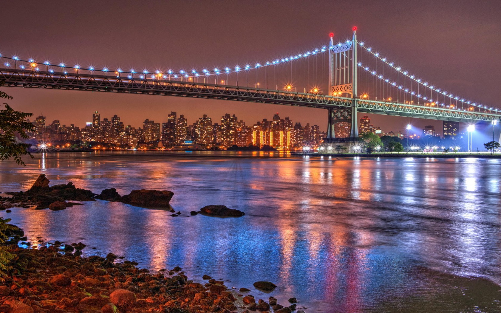 Description: A bridge over a river with a city in the background at night time with lights on the bridge and the water reflecting off the water.