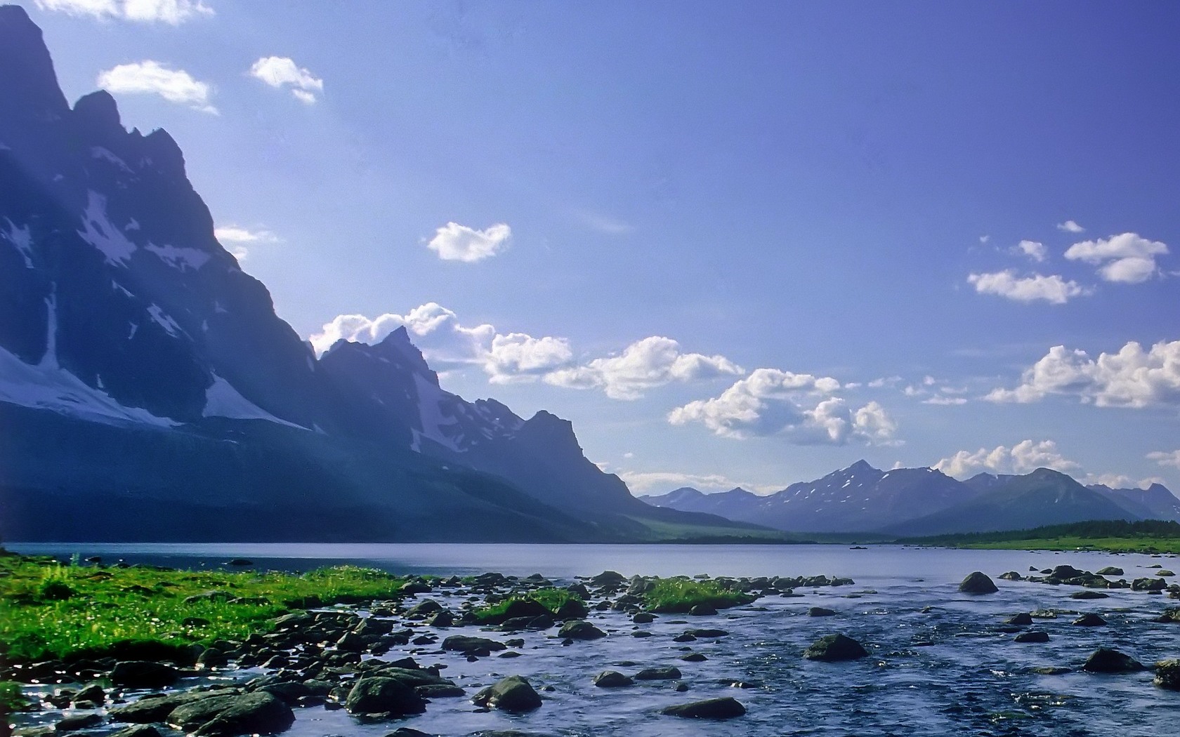 Description: A river running through a lush green valley under a blue sky with clouds and mountains in the background with a few clouds.
