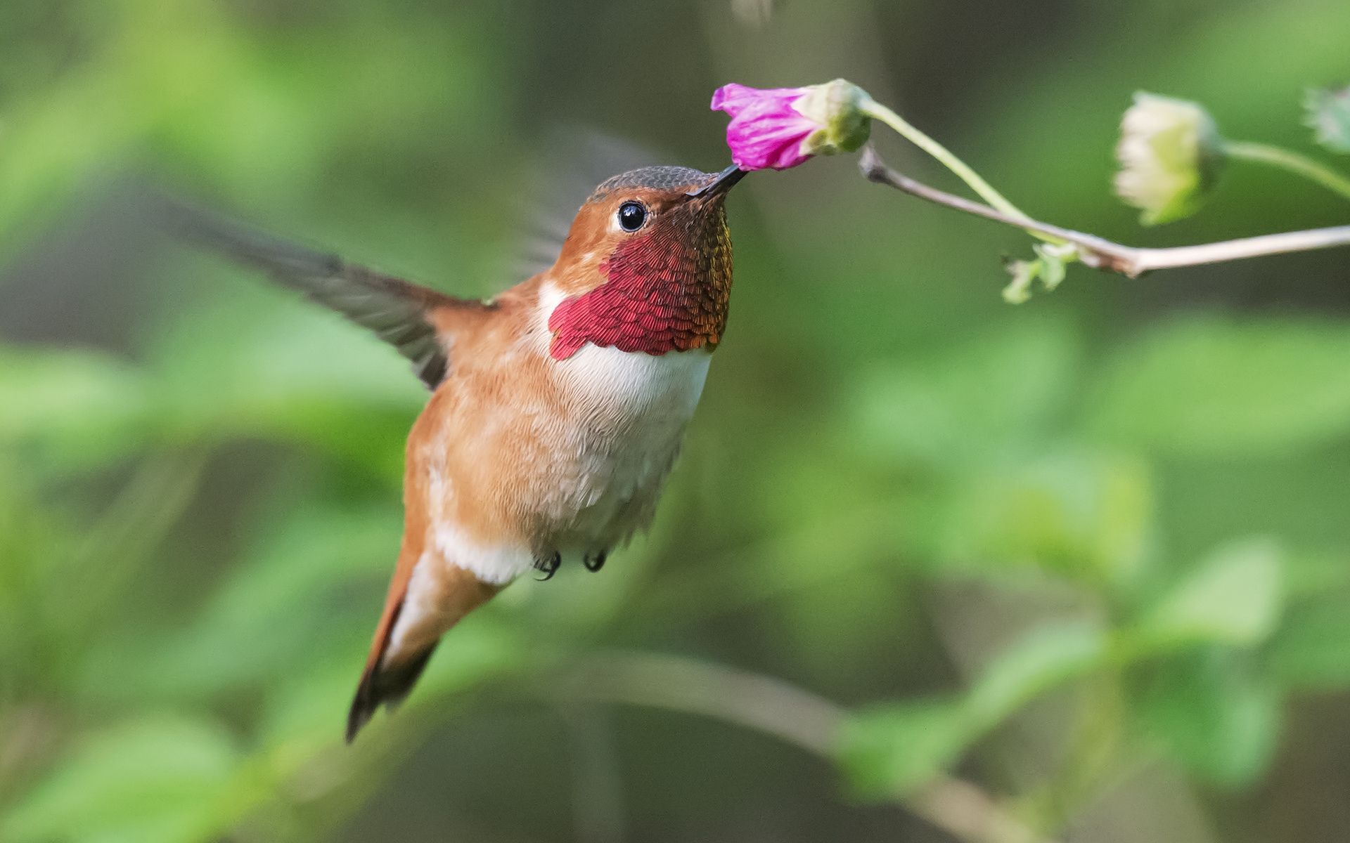 Description: A hummingbird is flying towards a flower in a tree branch with green leaves in the background and a blurry background.
