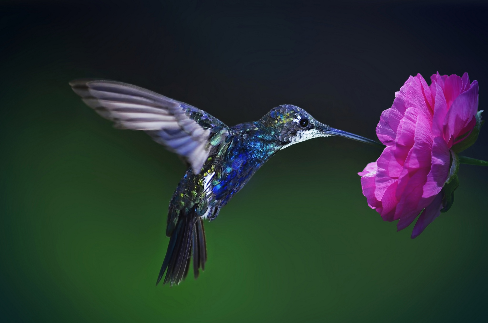 Description: A hummingbird flying towards a pink flower on a green background with a black background behind it and a green background behind it.