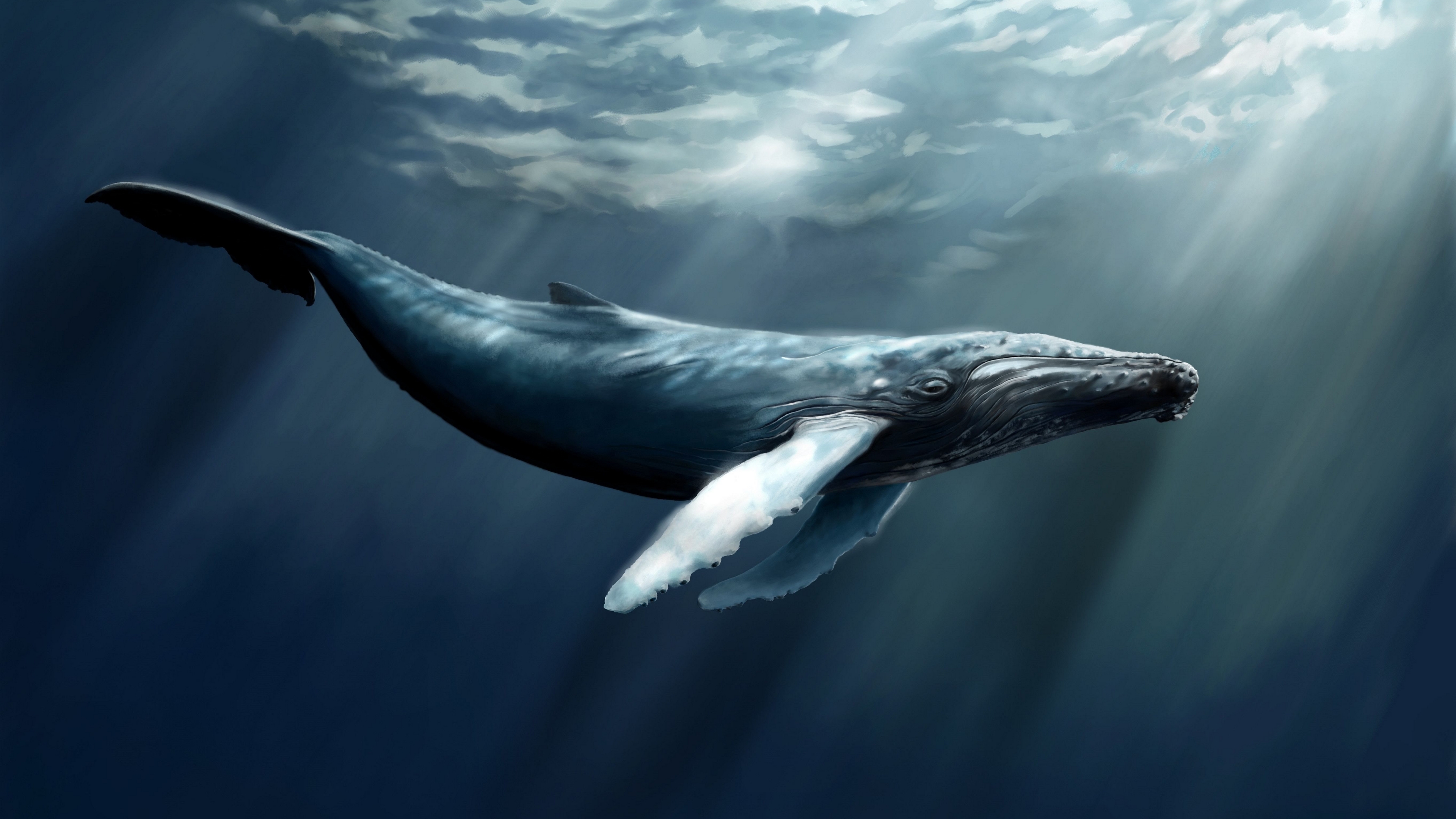 Description: A humpback whale swimming under the water's surface in the ocean with clouds overhead and sunlight shining through the water.