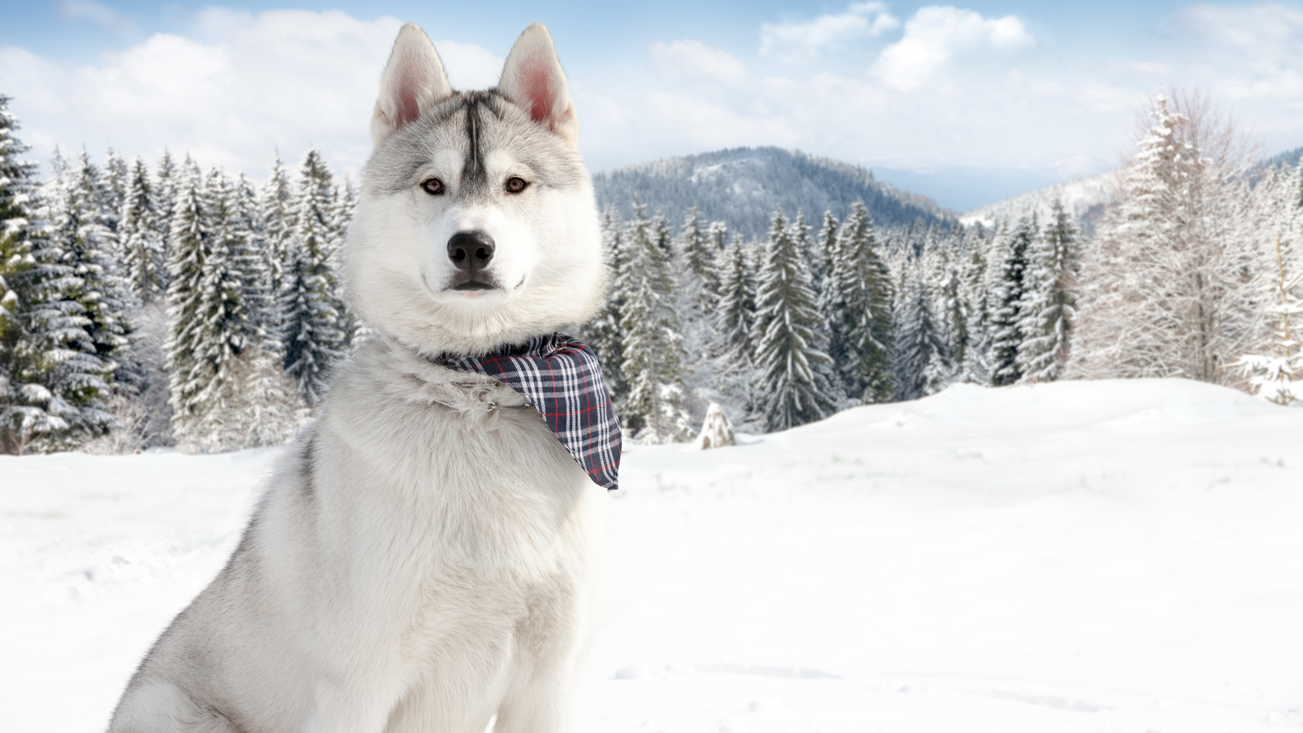 Description: A husky dog wearing a bow tie in the snow with trees in the background and a blue sky with clouds.