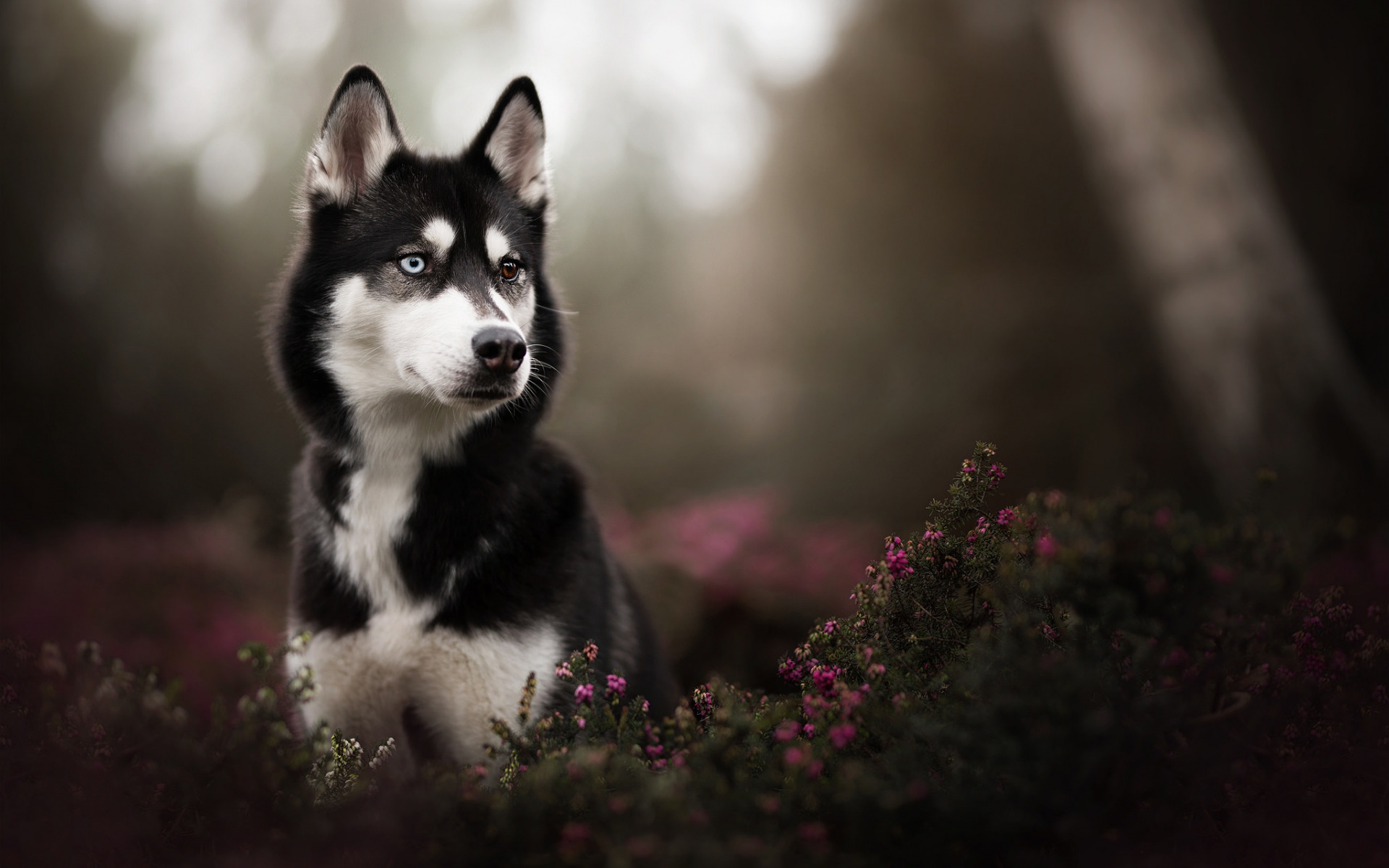 Description: A husky dog is sitting in a field of flowers and trees in the background is a forest with purple flowers.