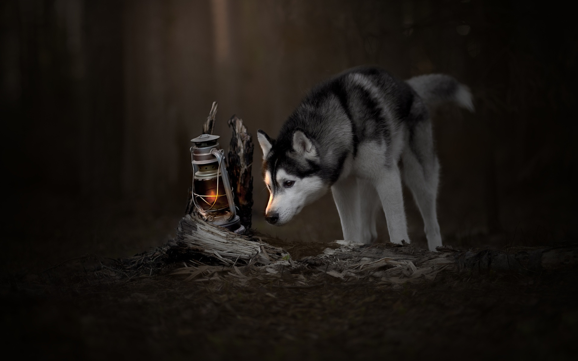 Description: A husky dog sniffing a pair of shoes in the woods at night time.