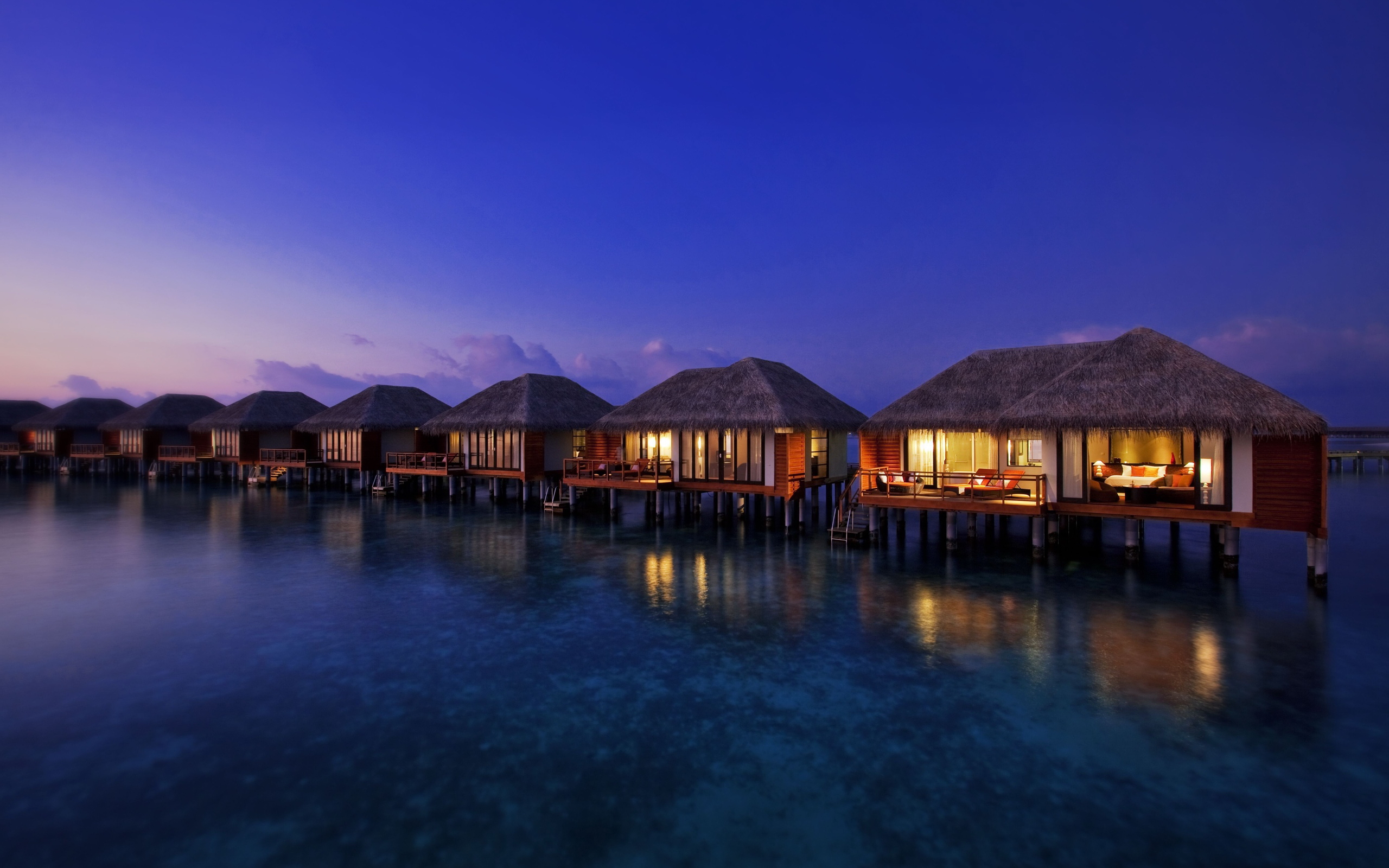 Description: A row of huts sitting on top of a body of water next to a pier at night time with lights on.