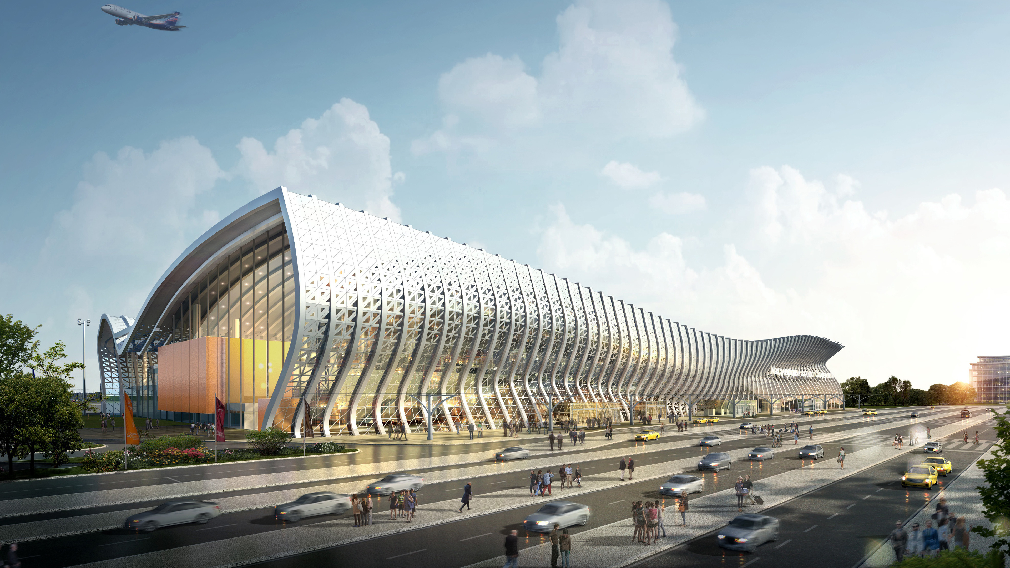 Description: A rendering of a large building with a glass facade and a large passenger walkway leading to it and a plane flying overhead.