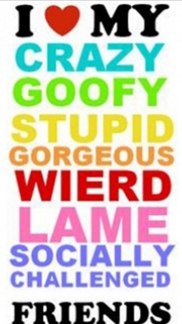 Description: A poster with words that say i love my crazy goofy stupid weird weird lame socially challenged friends.
