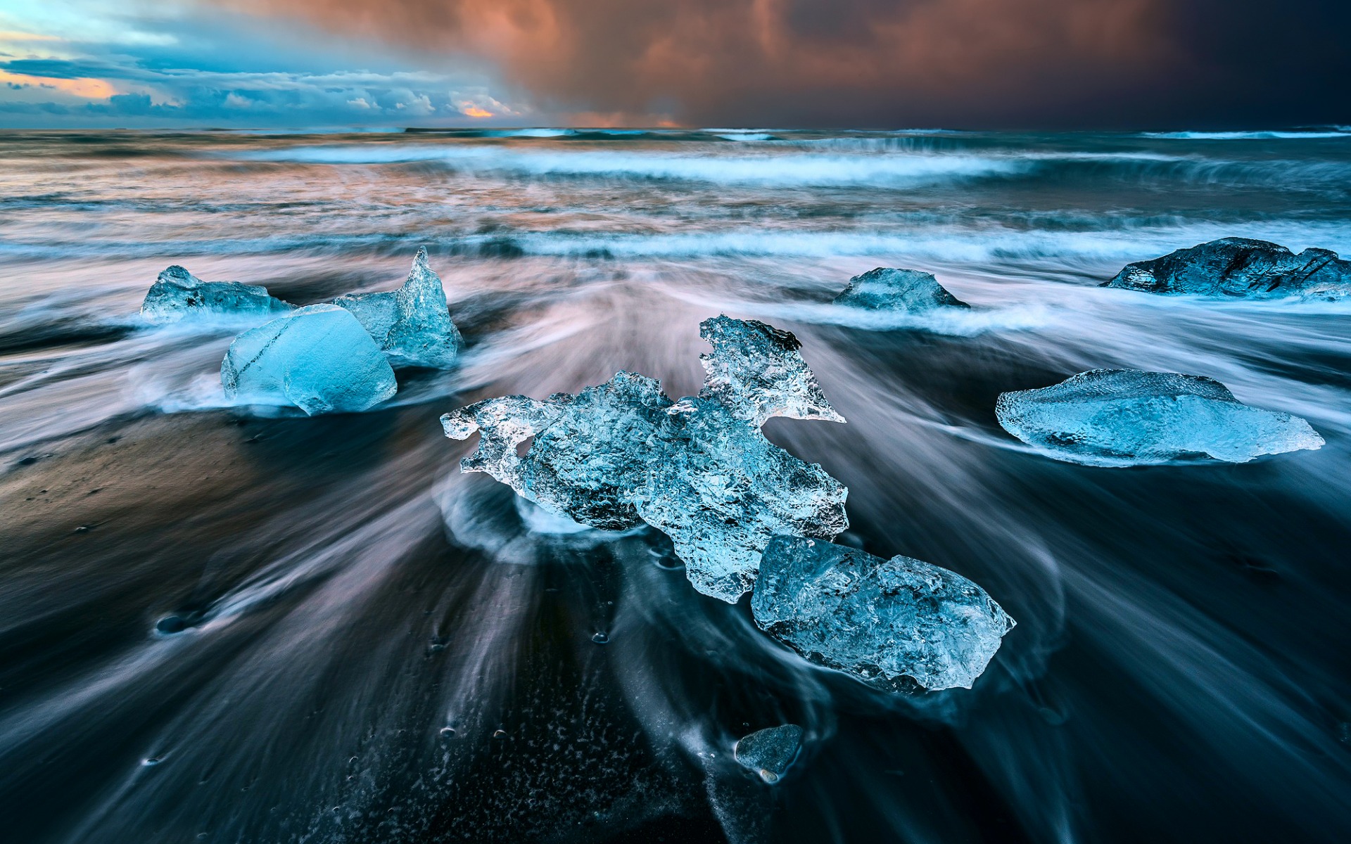 Description: A bunch of ice chunks are on the beach near the water and clouds in the sky above them.