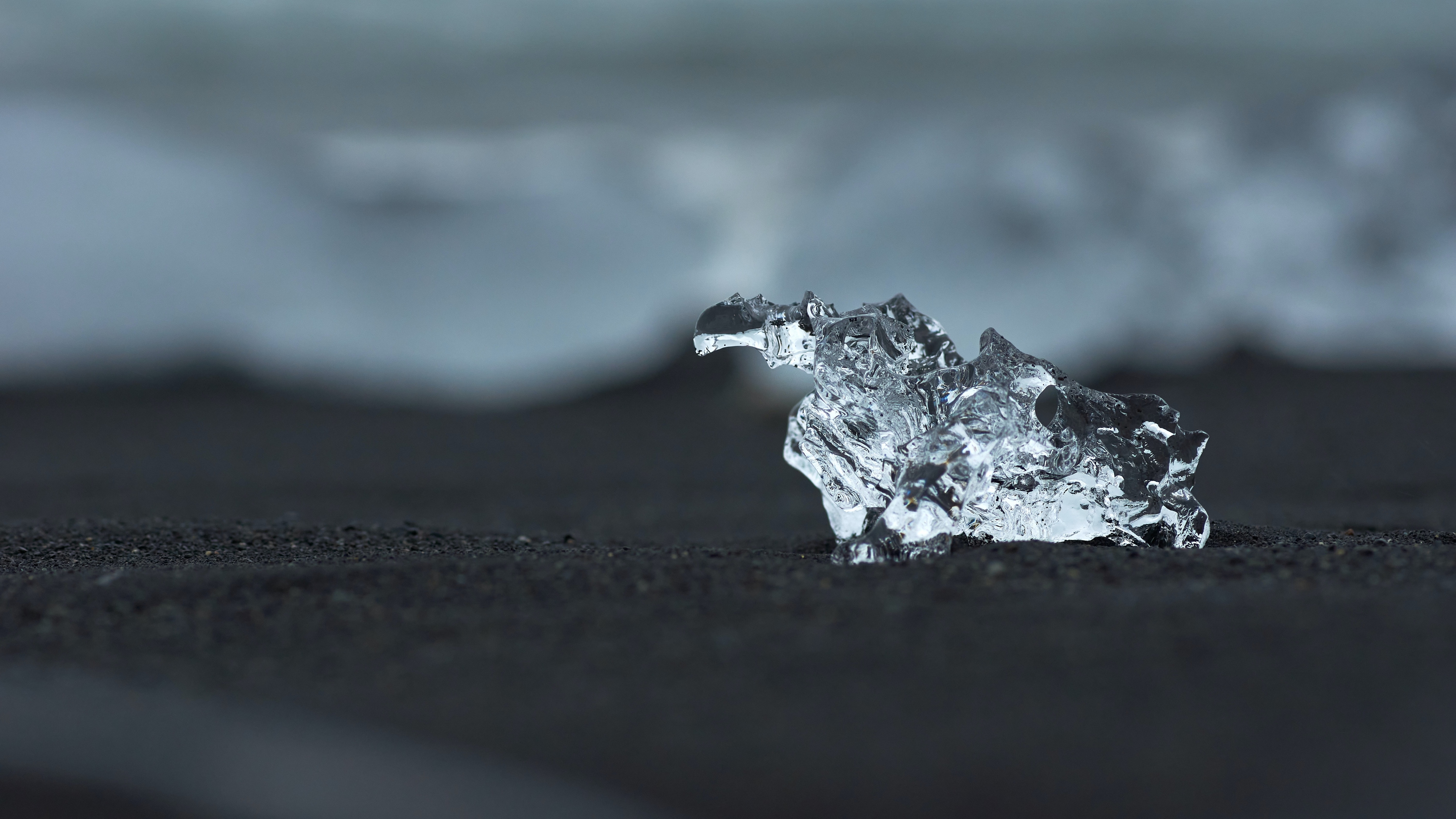 Description: A piece of ice sitting on top of a black sand beach next to the ocean with waves coming in.