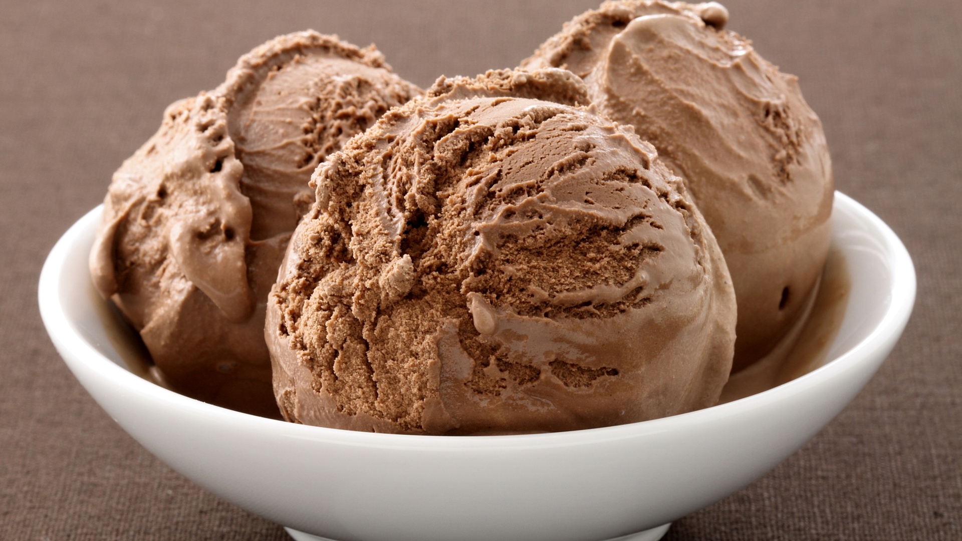 Description: A bowl of ice cream on a brown tablecloth with a spoon in it and a spoon in the bowl.