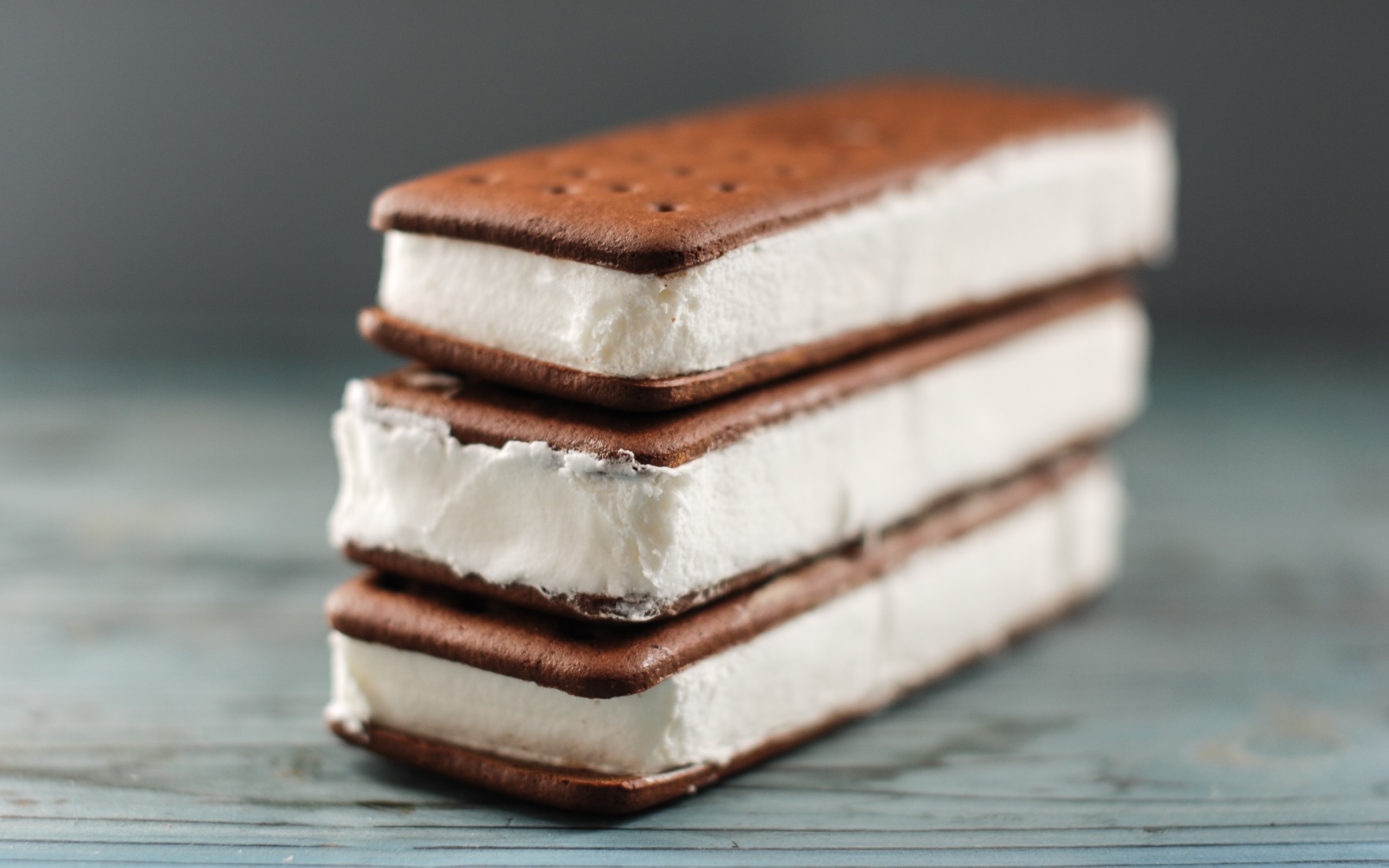 Description: Three ice cream sandwiches stacked on top of each other on a table with a blue background and a gray background.