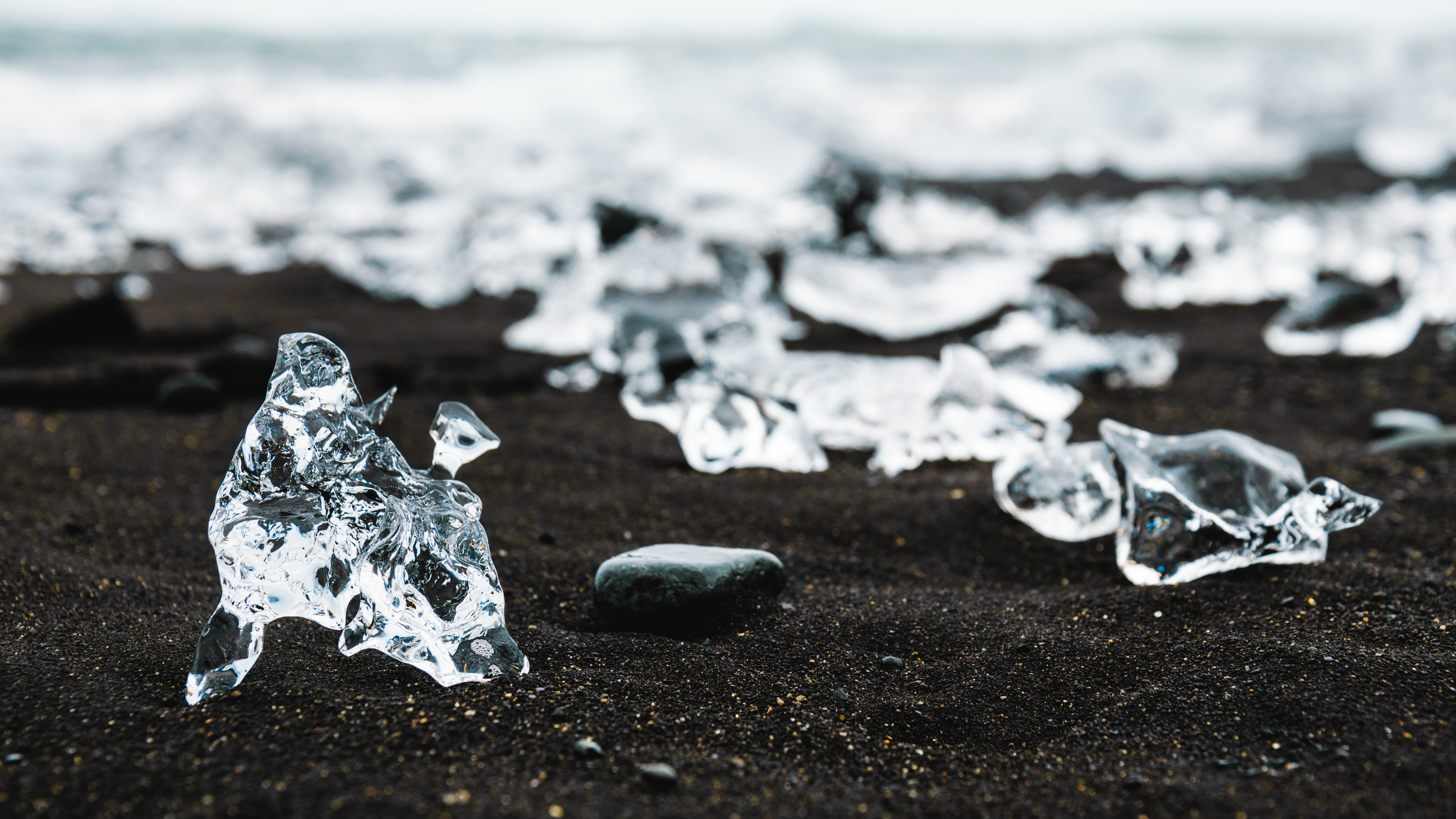 Description: A bunch of ice crystals on a beach near the ocean shore with rocks and water in the background and a rock in the foreground.