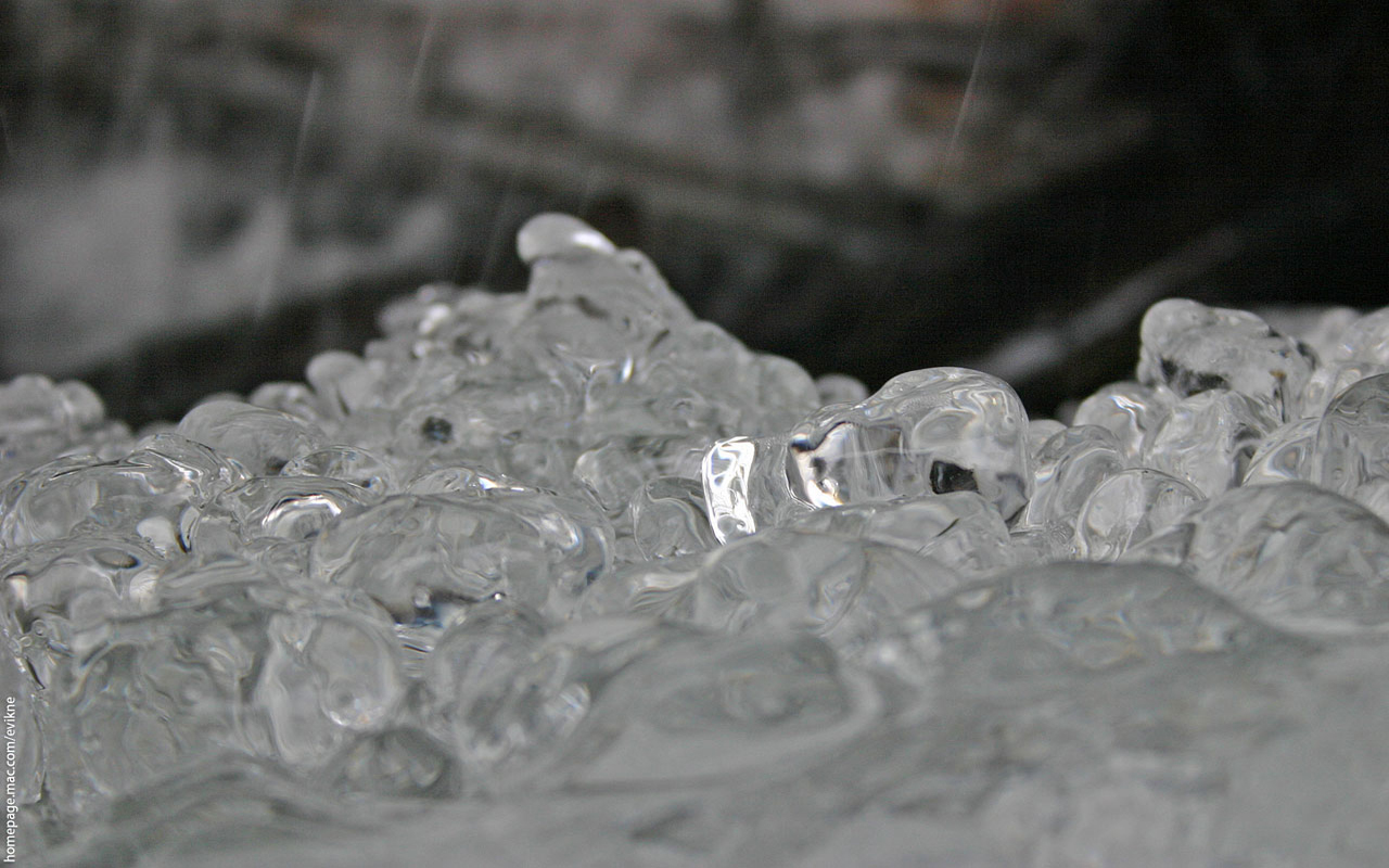 Description: A close up of a pile of ice cubes on a table top with water droplets on the surface.