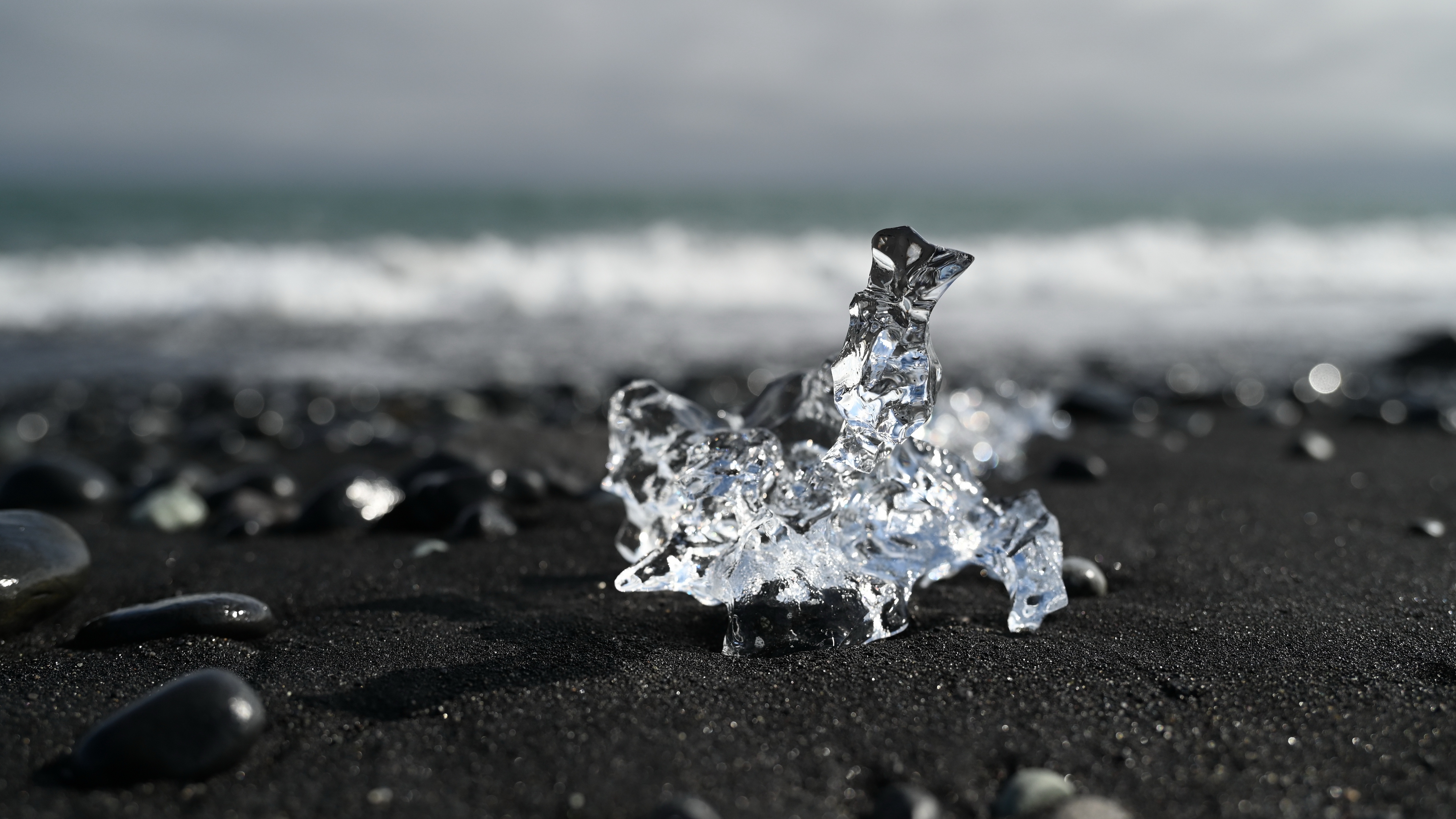 Description: A piece of ice that is sitting in the sand on the beach near the water and rocks on the beach.