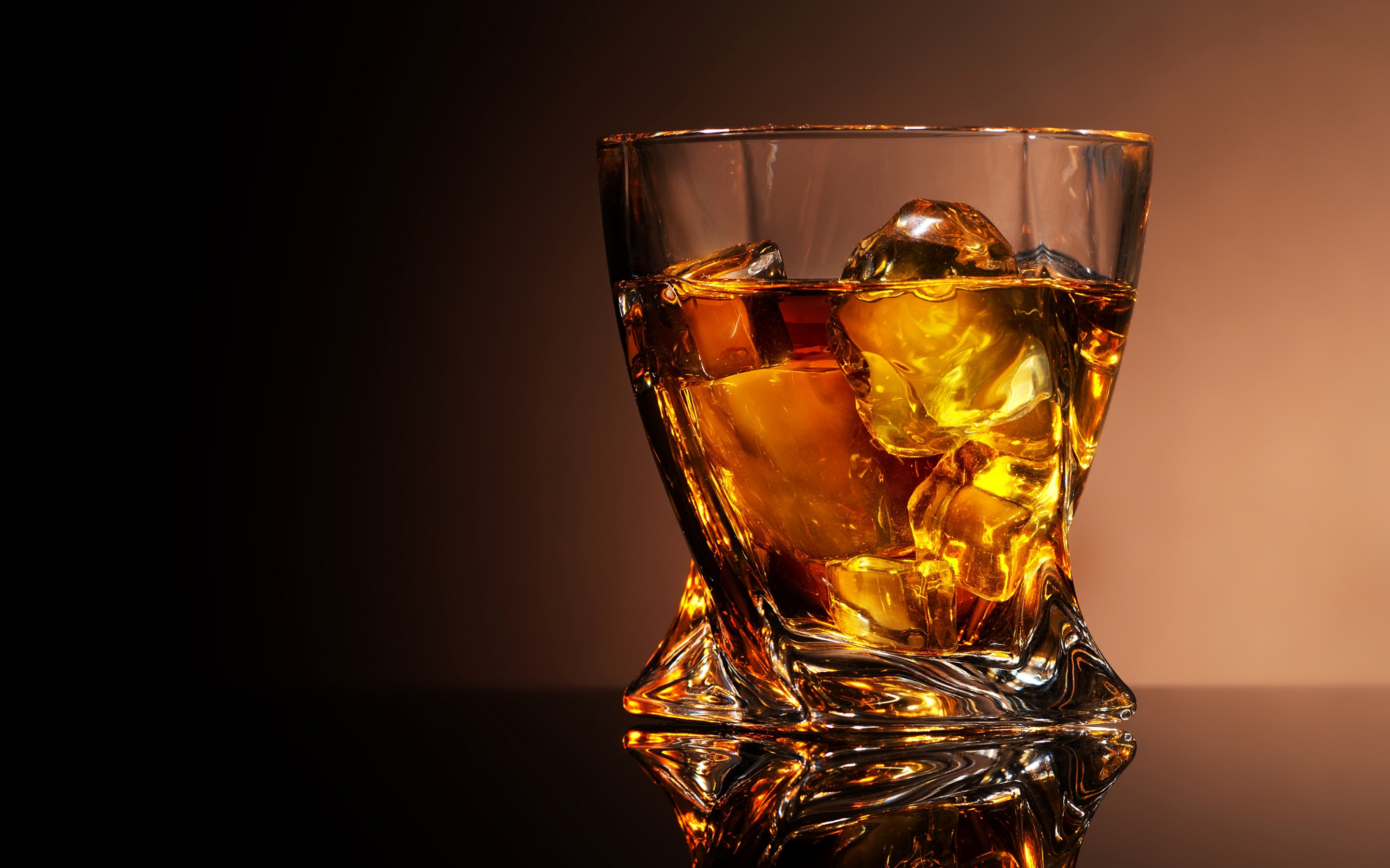 Description: A glass of ice tea with a brown background and a reflection of ice cubes in it.