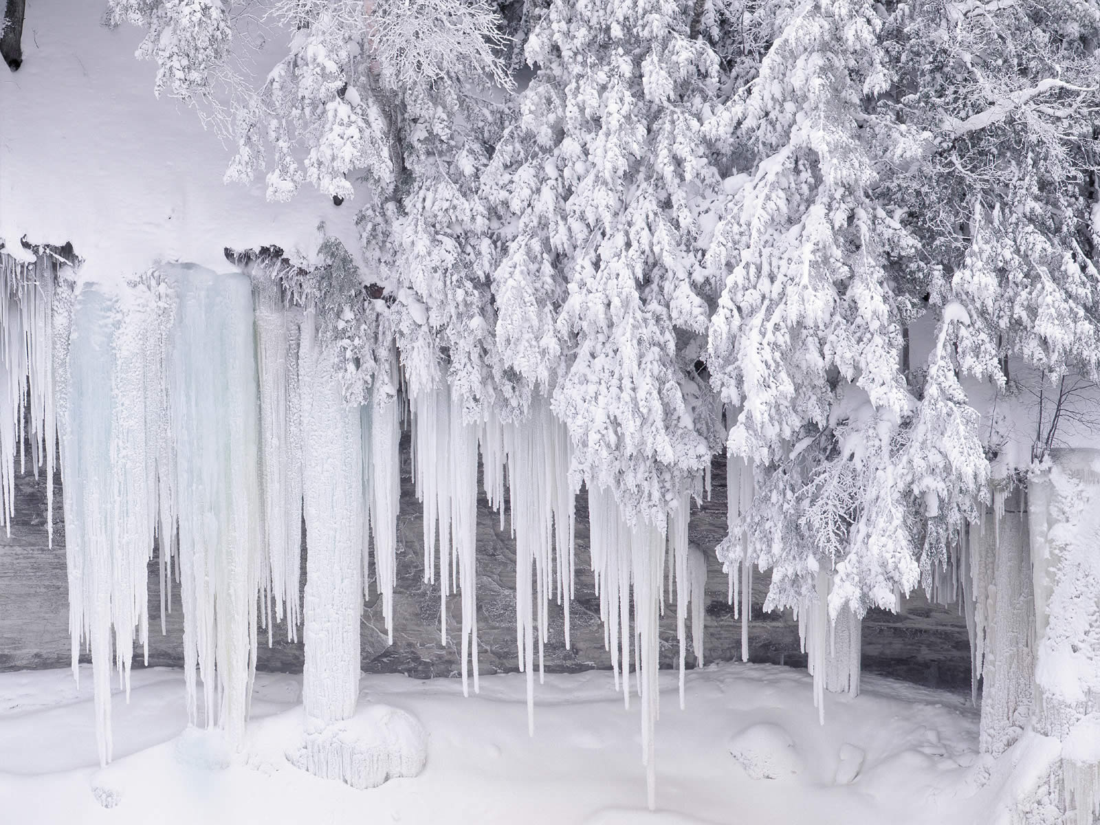 Description: A group of trees covered in ice and icicles in the snow near a river and a forest with snow covered trees.