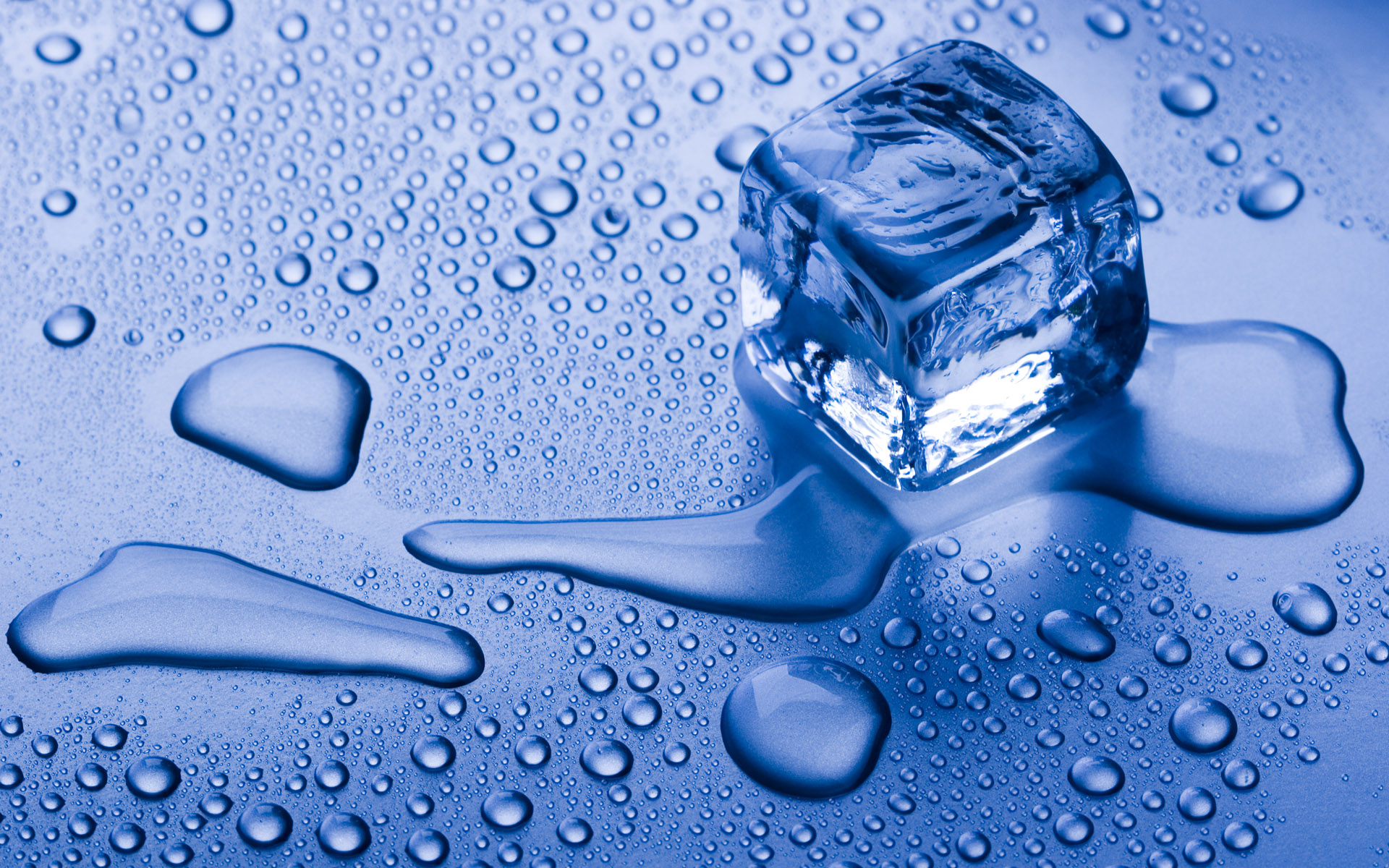 Description: A ice cube with water drops on it and a blue background with a blue hued background and a blue hued background.
