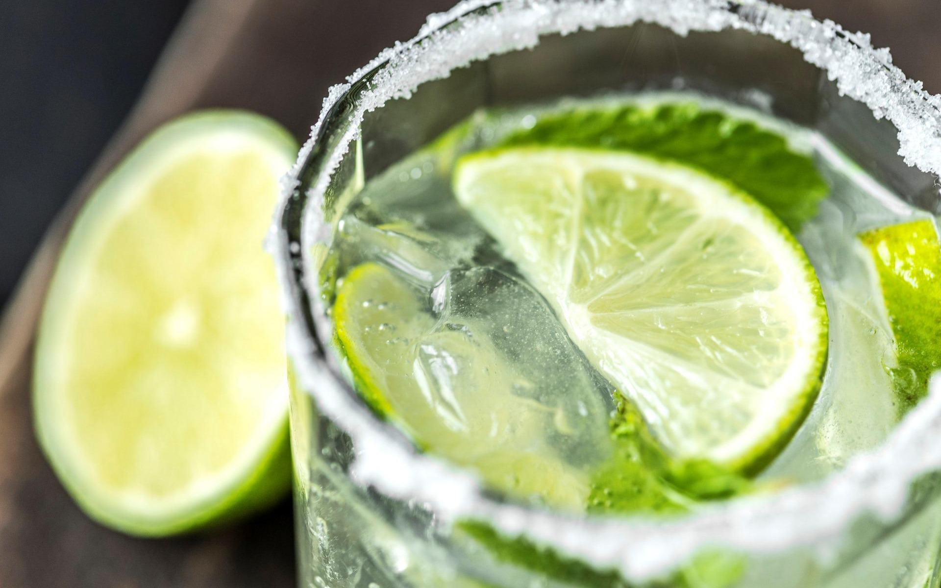 Description: A glass of ice water with limes and a slice of lime on the side of it with a spoon.