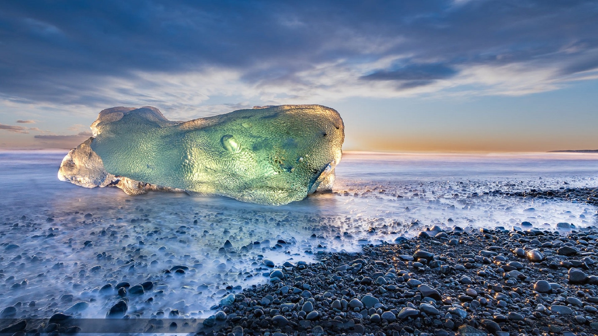 Description: A large iceberg floating on top of a rocky beach next to the ocean at sunset or dawn with a cloudy sky.