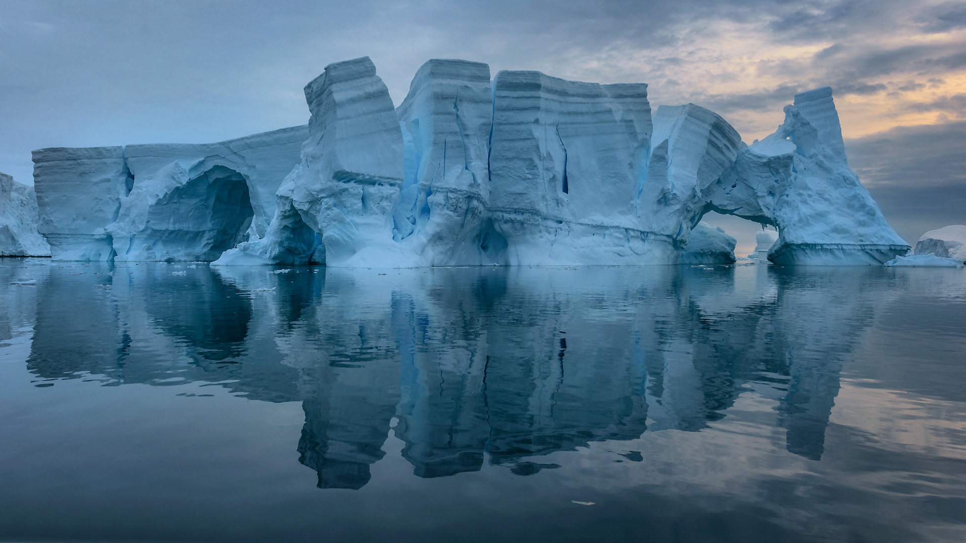 Description: A large iceberg floating on top of a lake under a cloudy sky with a few clouds above it.