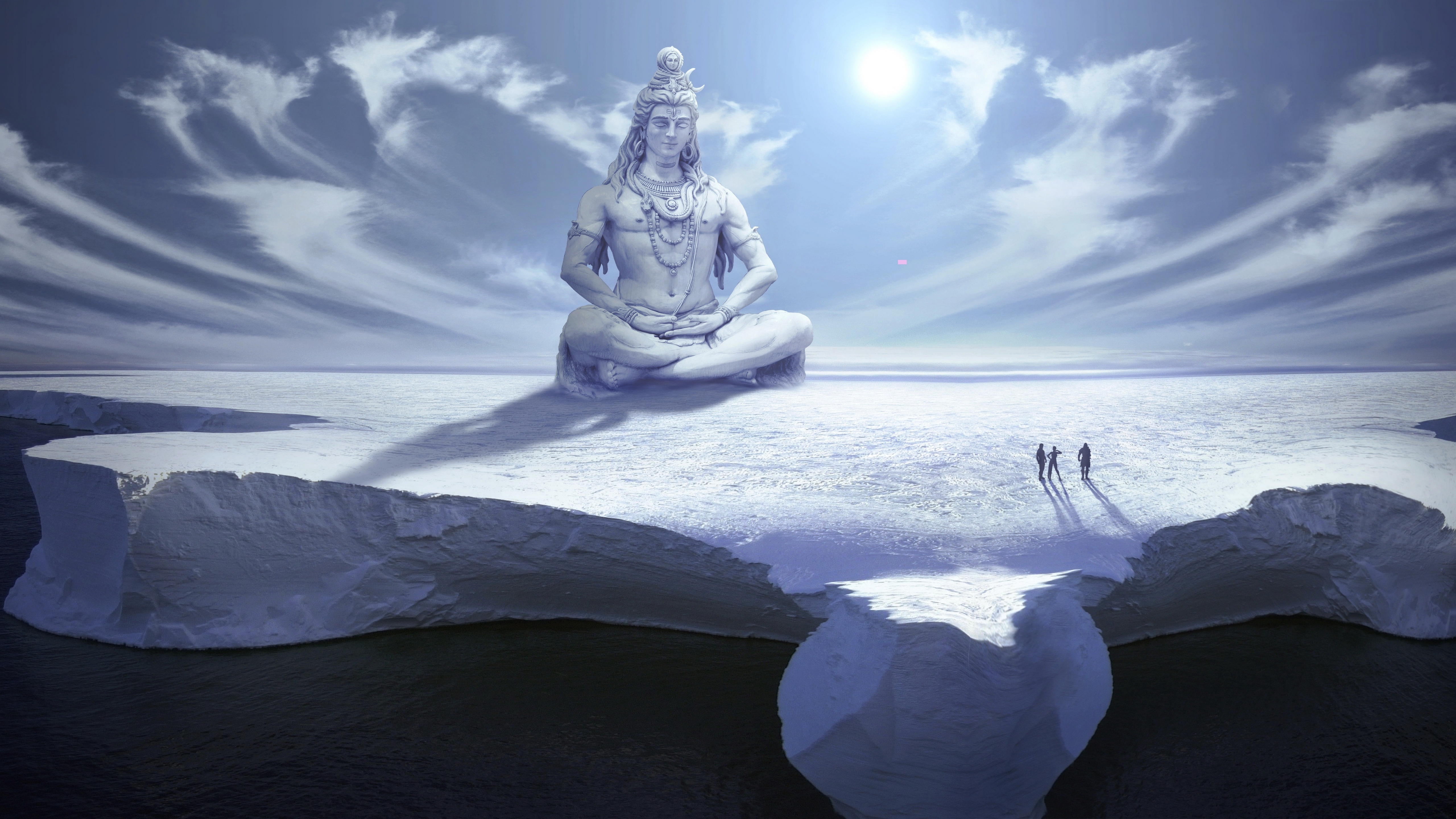 Description: A man sitting on top of a large iceberg next to a person standing on the ice in the water.