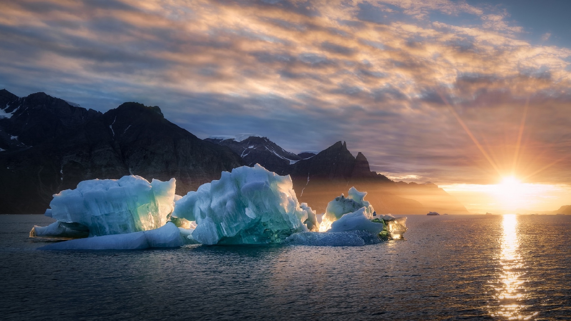 Description: A group of icebergs floating in the ocean at sunset with mountains in the background and a sun setting.