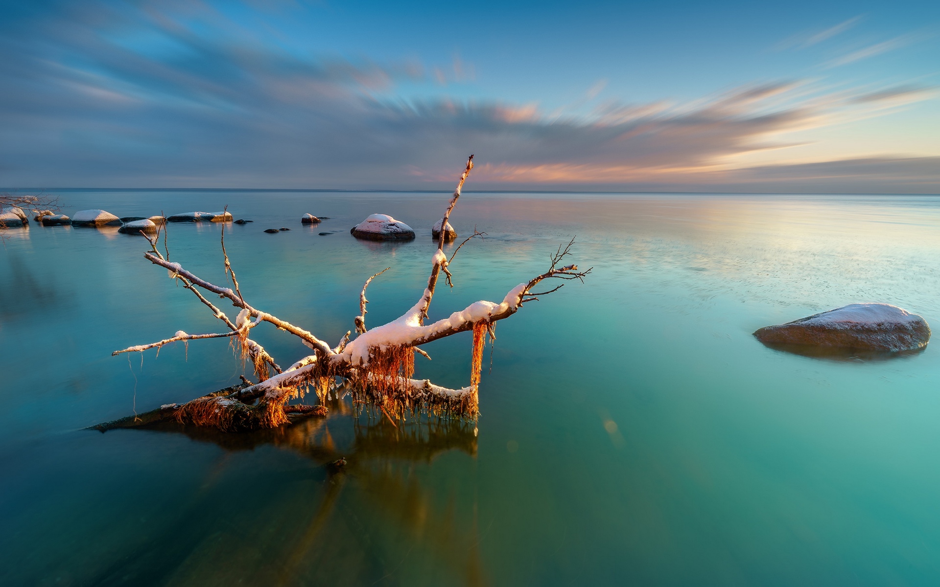 Description: A tree that is sitting in the water near rocks and water with a sky background and clouds in the sky.