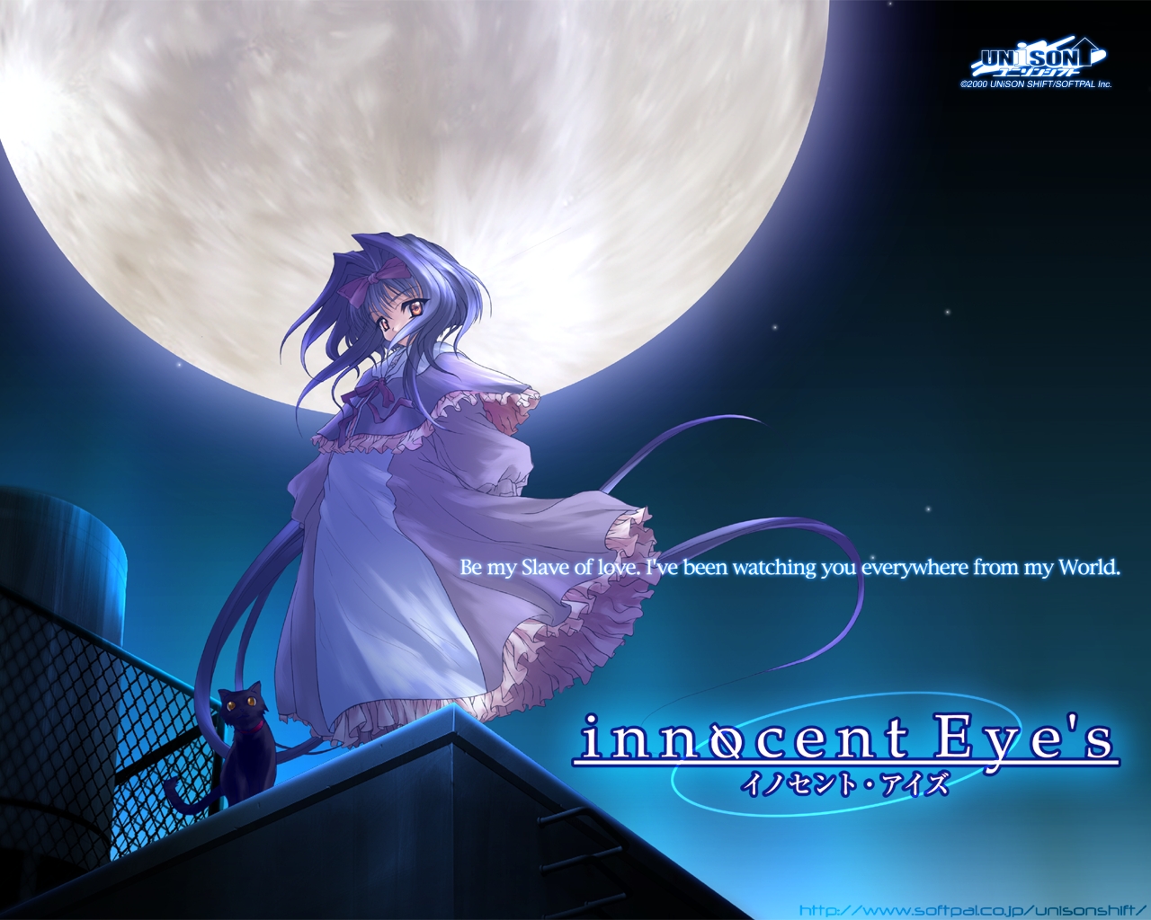 Description: A woman in a dress standing on a roof with a cat in front of a full moon and a caption that reads innocent eyes.