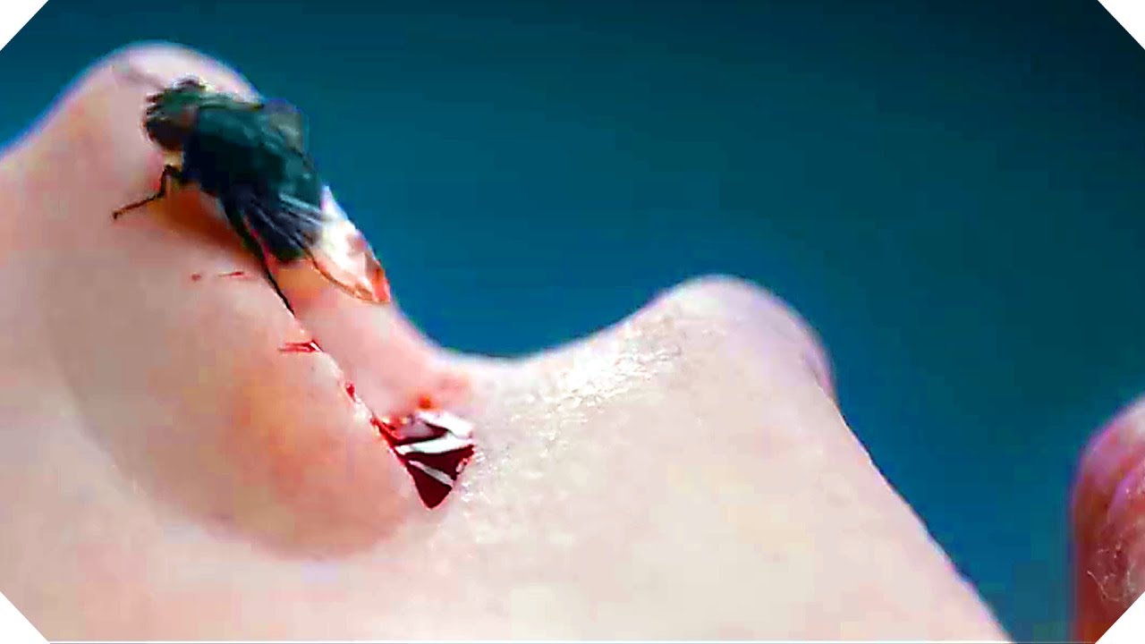 Description: A small insect on the tip of a persons finger with blood on it's skin and a blue background.