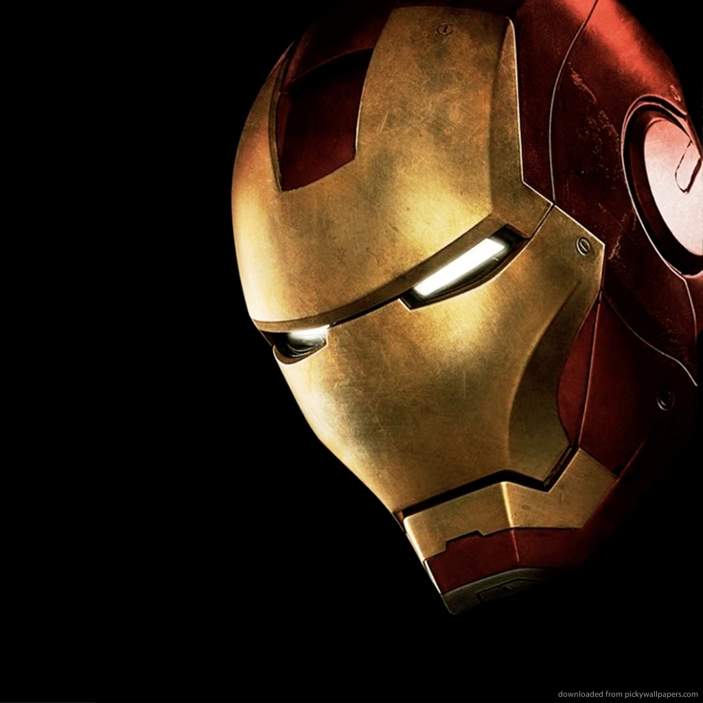 Description: A close up of a iron man mask on a black background with a light shining on it's face.