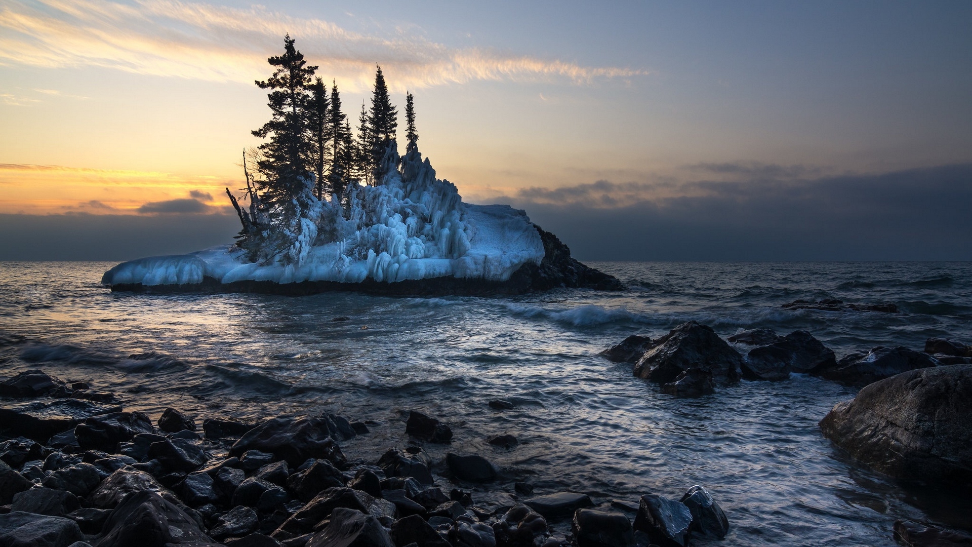 Description: A small island with trees on it in the middle of the ocean at sunset or dawn with a few clouds.
