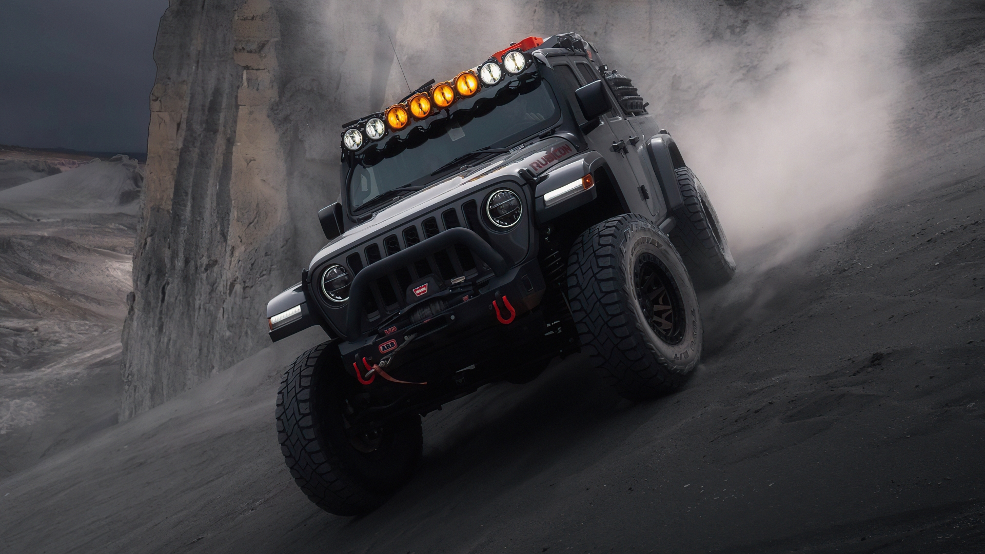 Description: A jeep driving on a rocky road with fog coming off the side of it and a rock cliff in the background.