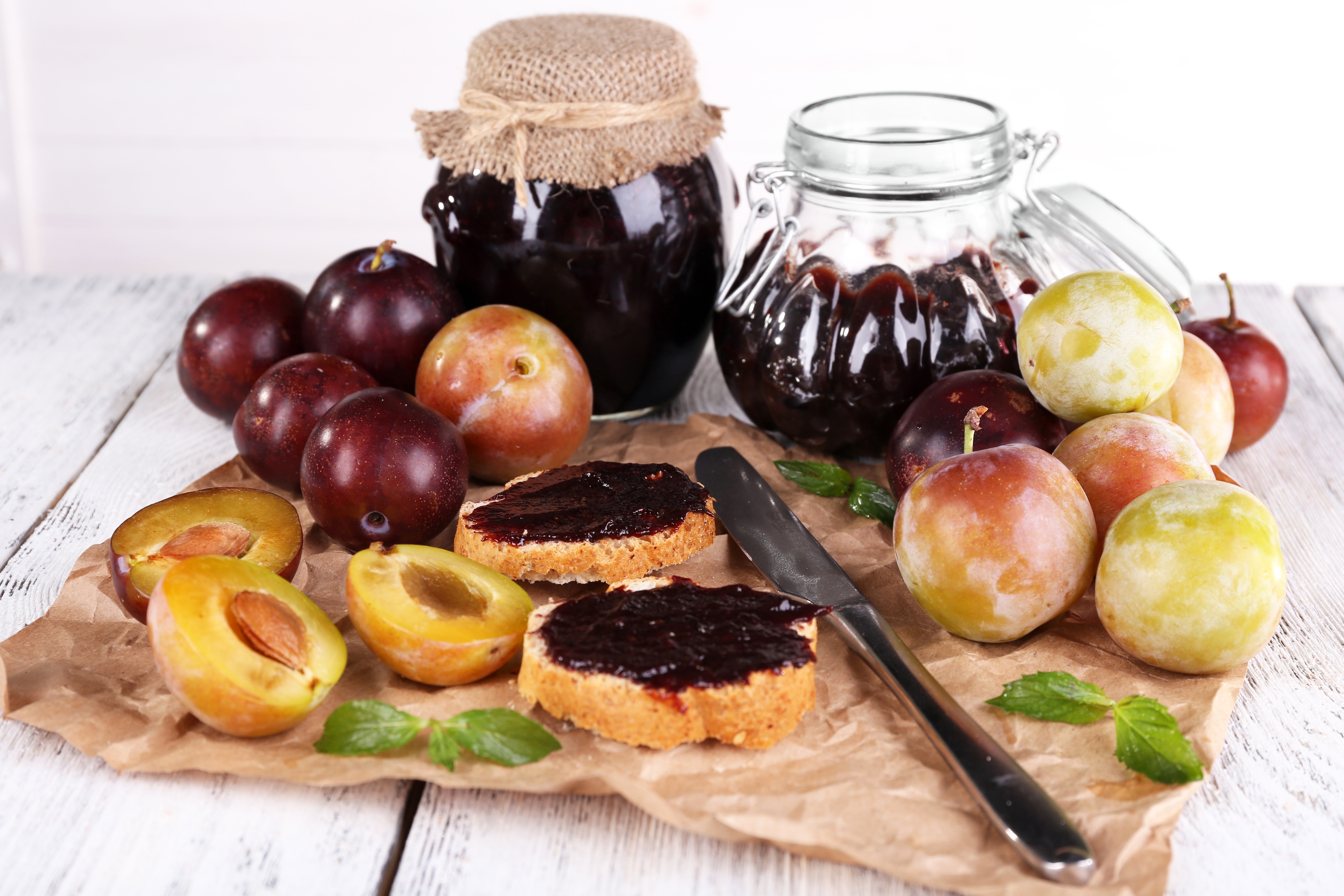 Description: A table topped with a jar of jelly and fruit next to a knife and a jar of jam on a piece of paper.