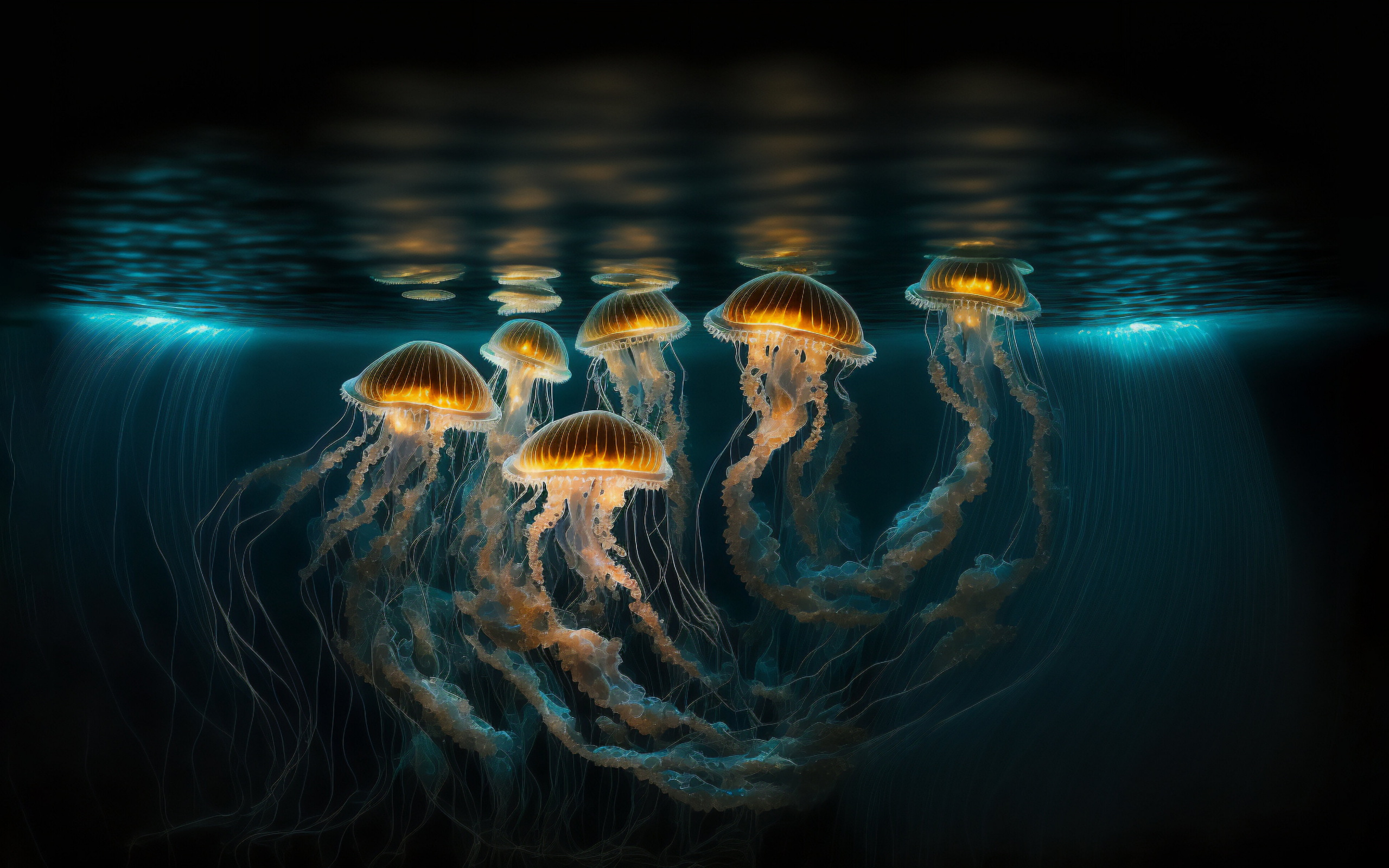 Description: A group of jellyfish swimming in the ocean together with a dark background and a light reflection on the water.