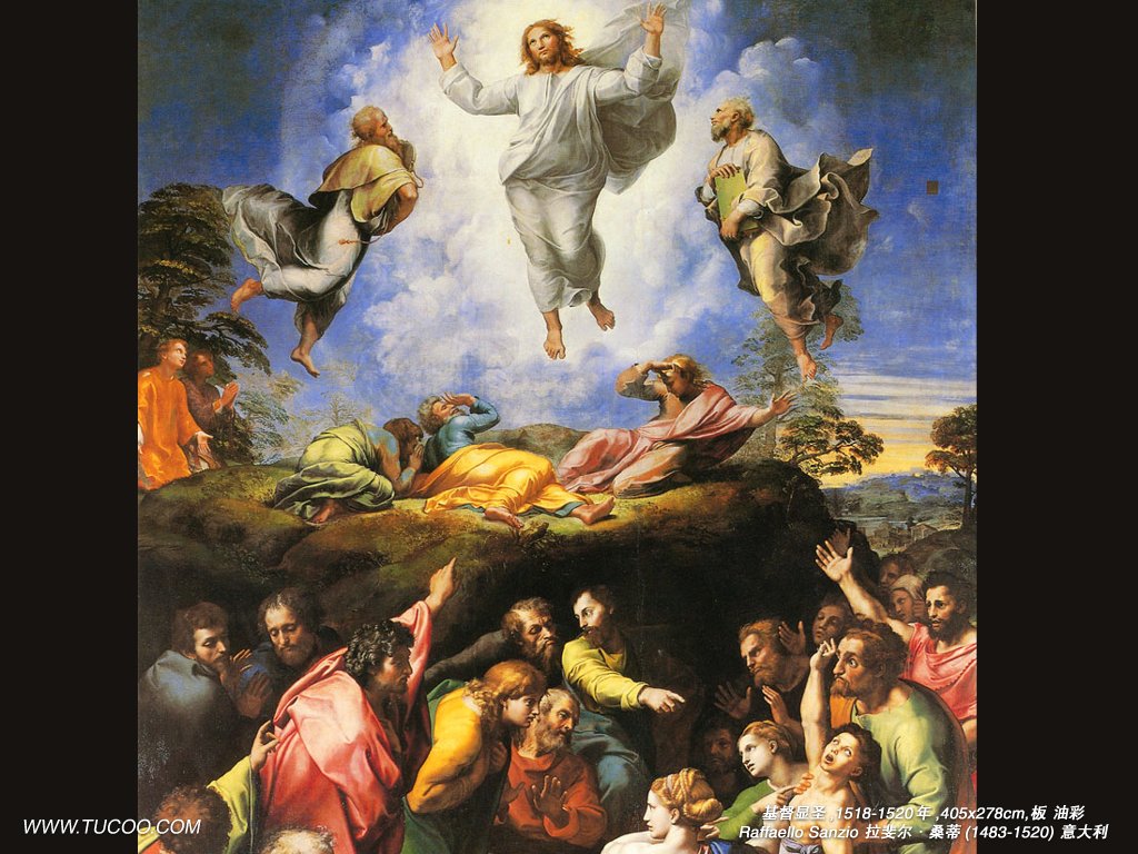 Description: A painting of jesus surrounded by angels and other people in a field of grass and trees.
