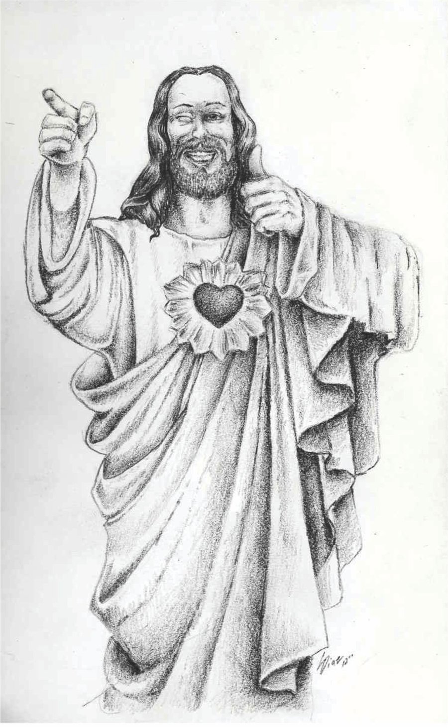 Description: A drawing of jesus holding a heart and a cross in his hand with a smile on his face and a smile on his face.