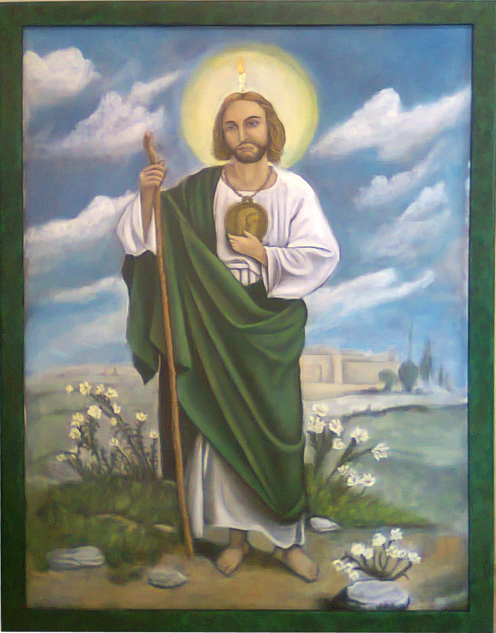 Description: A painting of jesus holding a stick and a golden egg in his hand with a cloudy sky behind him.