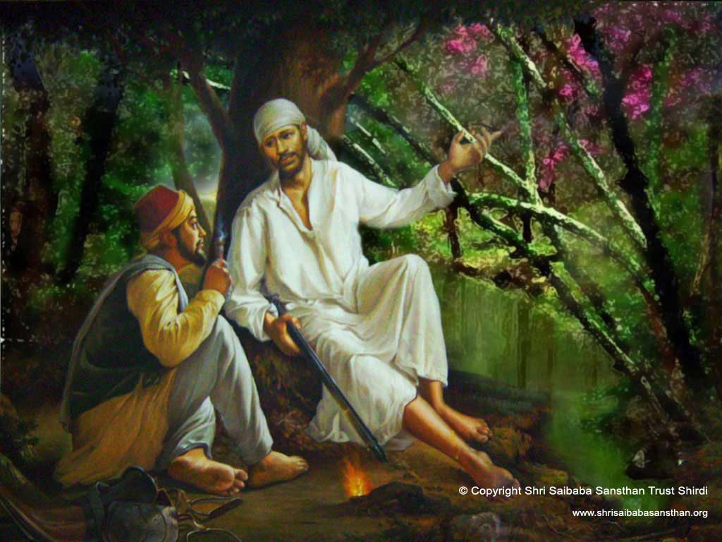 Description: A painting of jesus and a man sitting on a tree stump in the woods with a sword in his hand.