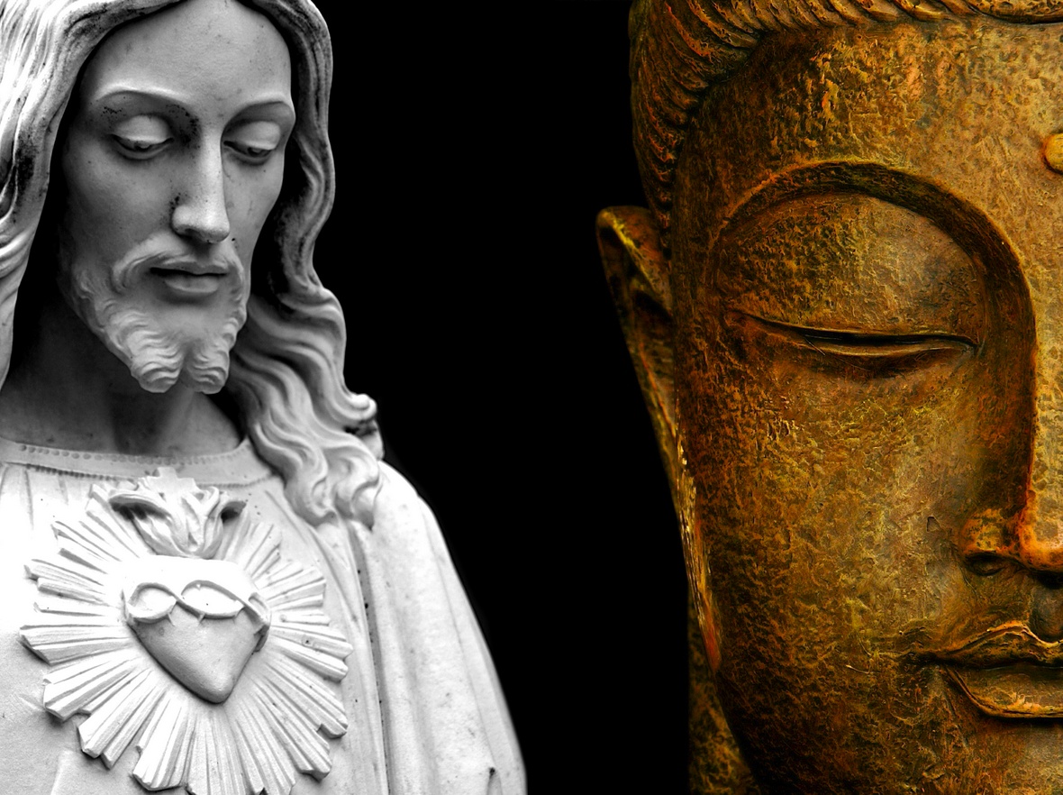 Description: A statue of jesus and a statue of a woman with a heart on her chest and a statue of a man with a cross on his chest.