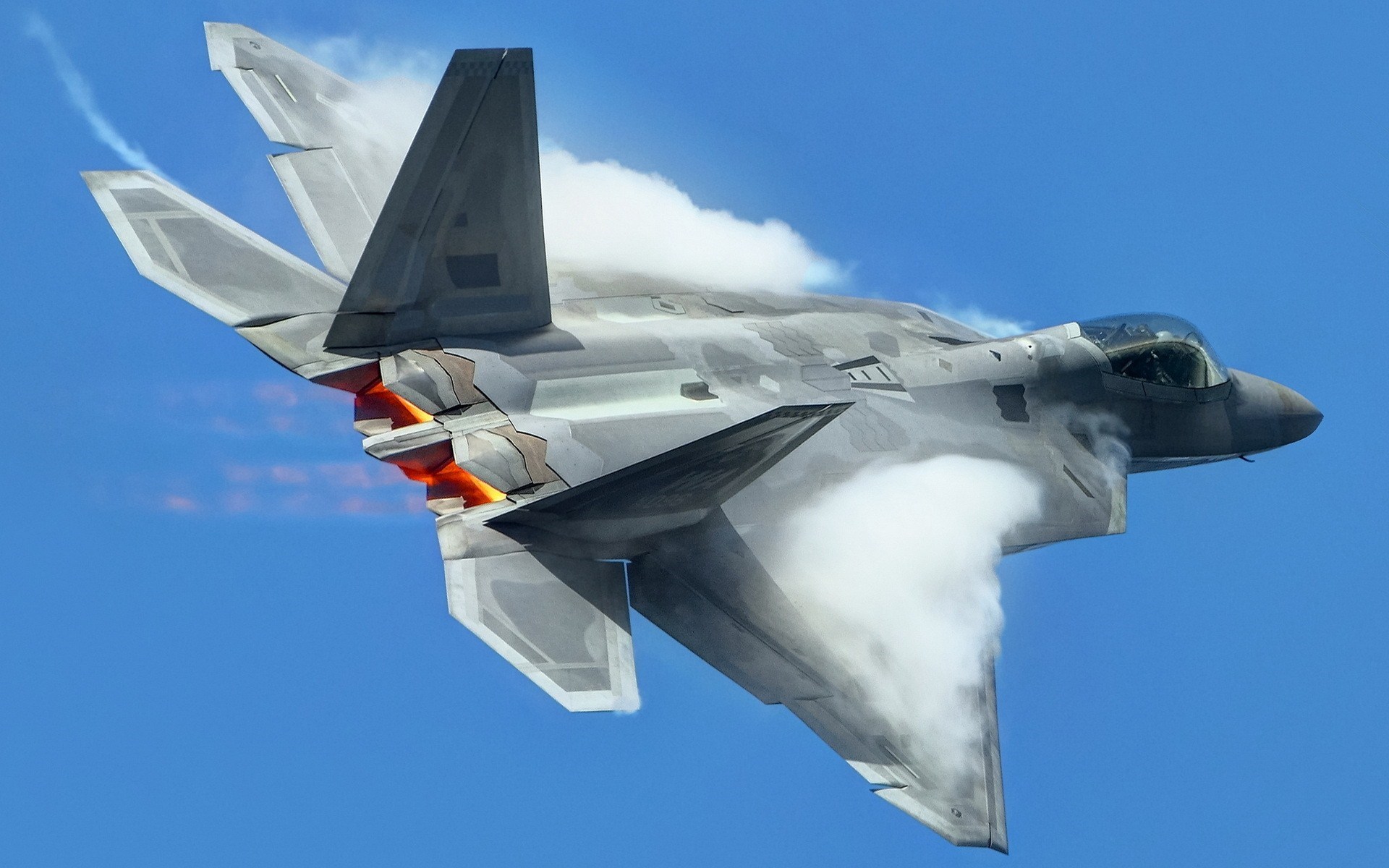 Description: A jet flying through a blue sky with smoke coming out of it's back end and a red tail.