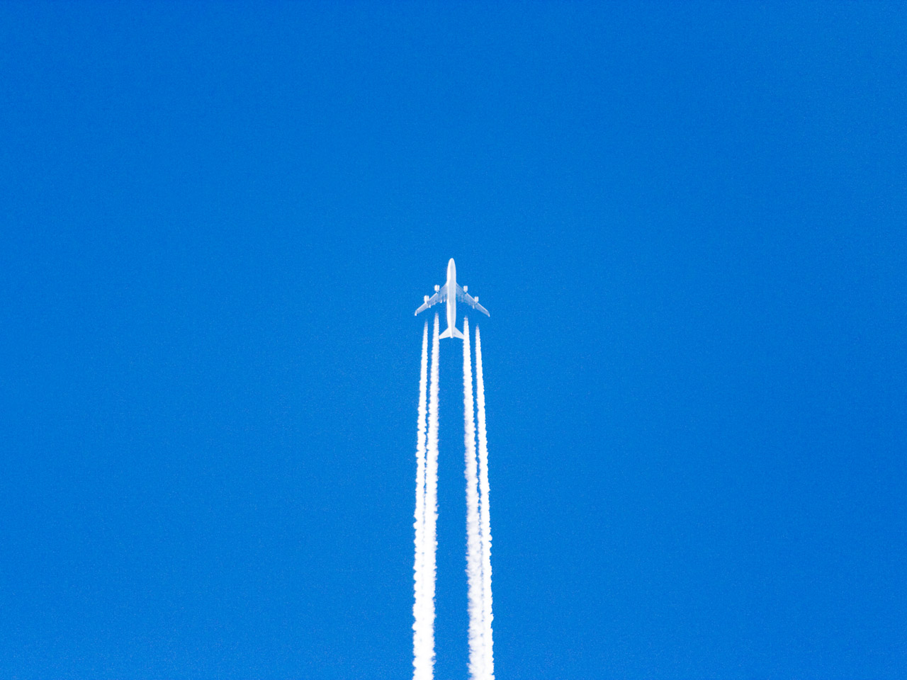 Description: A jet flying through a blue sky with two jets trailing behind it and a plane in the air with two contrails.
