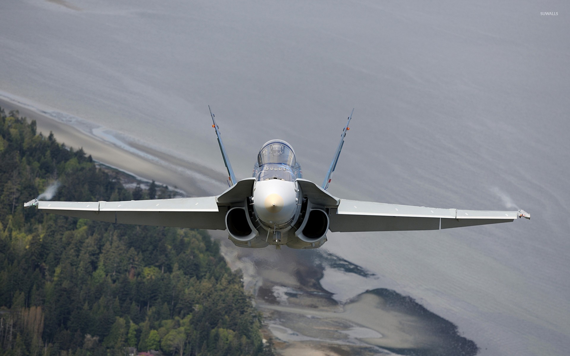 Description: A jet flying over a forest covered hillside next to a river and a beach in the distance with a sky background.