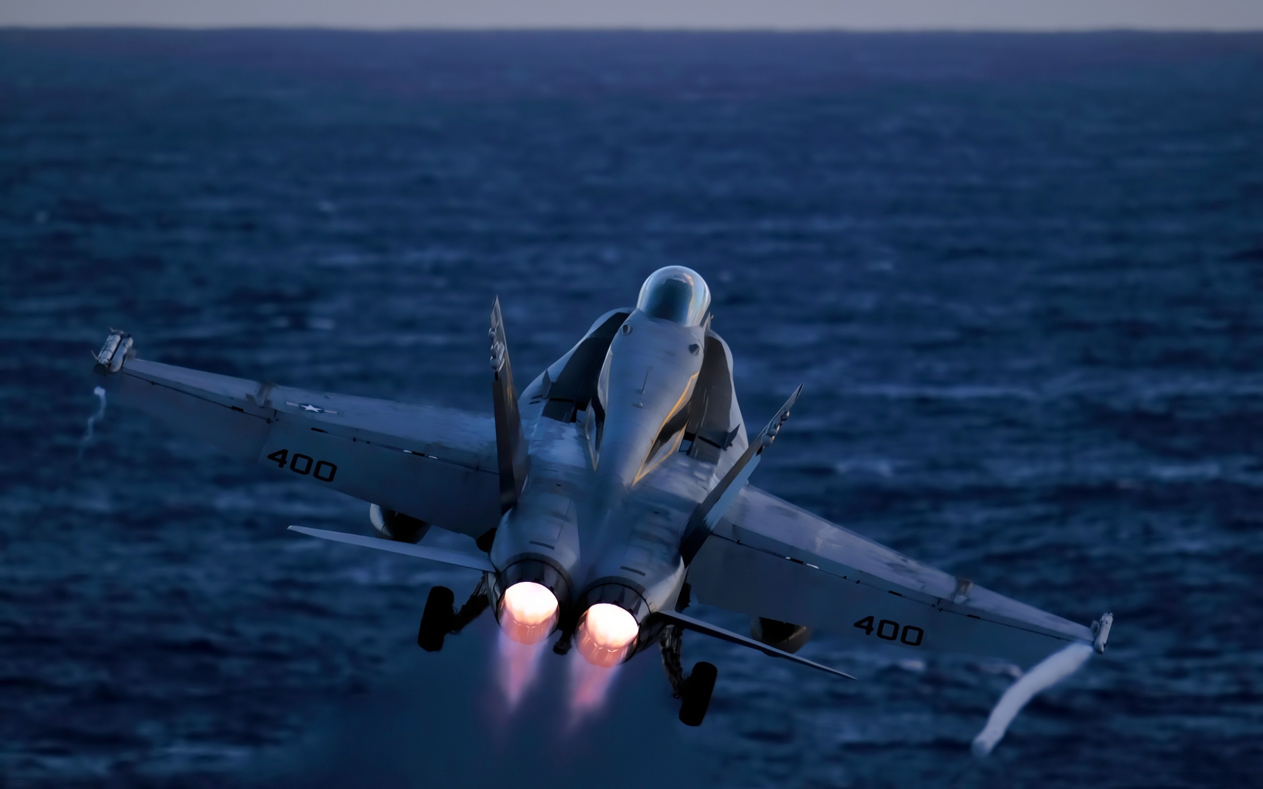Description: A jet flying over the ocean with a light on it's side and a jet flying above it.