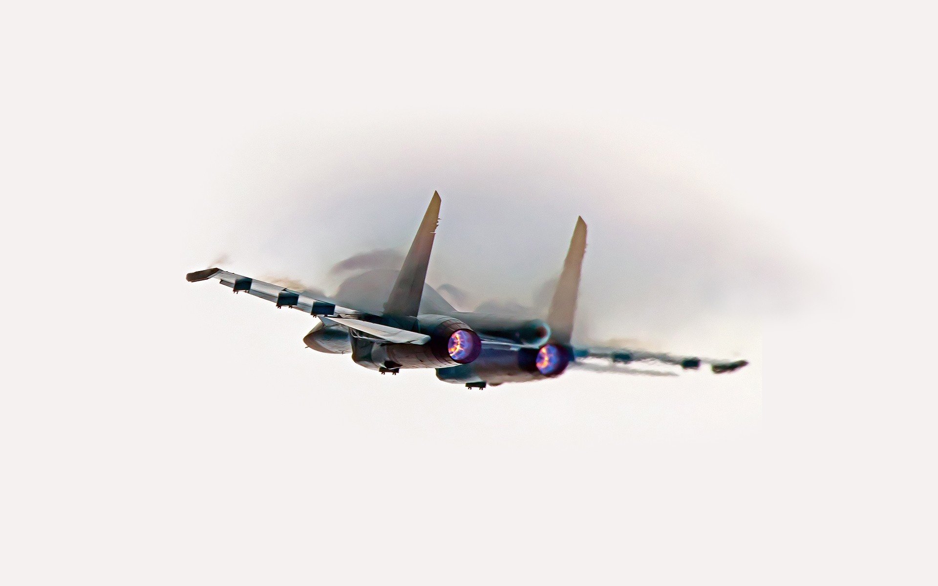 Description: A jet plane flying in the sky with a white background and a blurry image of the tail end of the plane.