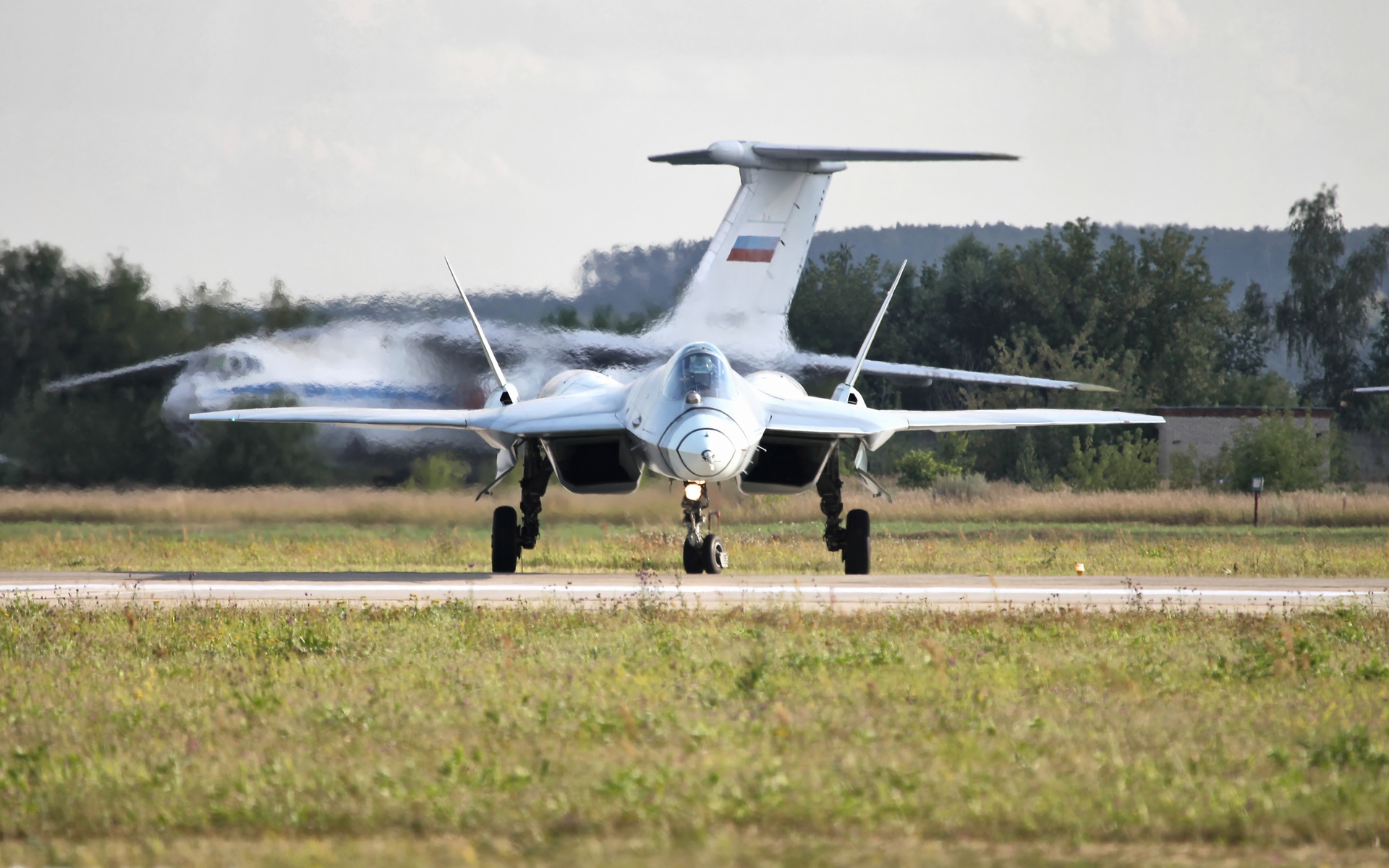 Description: A jet plane is on the runway with smoke coming out of it's wings and landing gear on the ground.