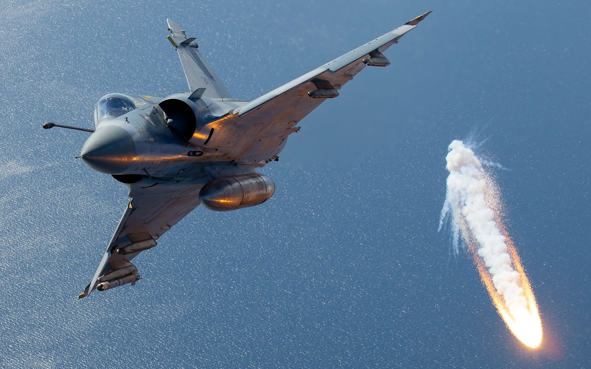 Description: A jet flying in the air with a rocket in the background and a jet in the air with a trail of smoke coming out of it.