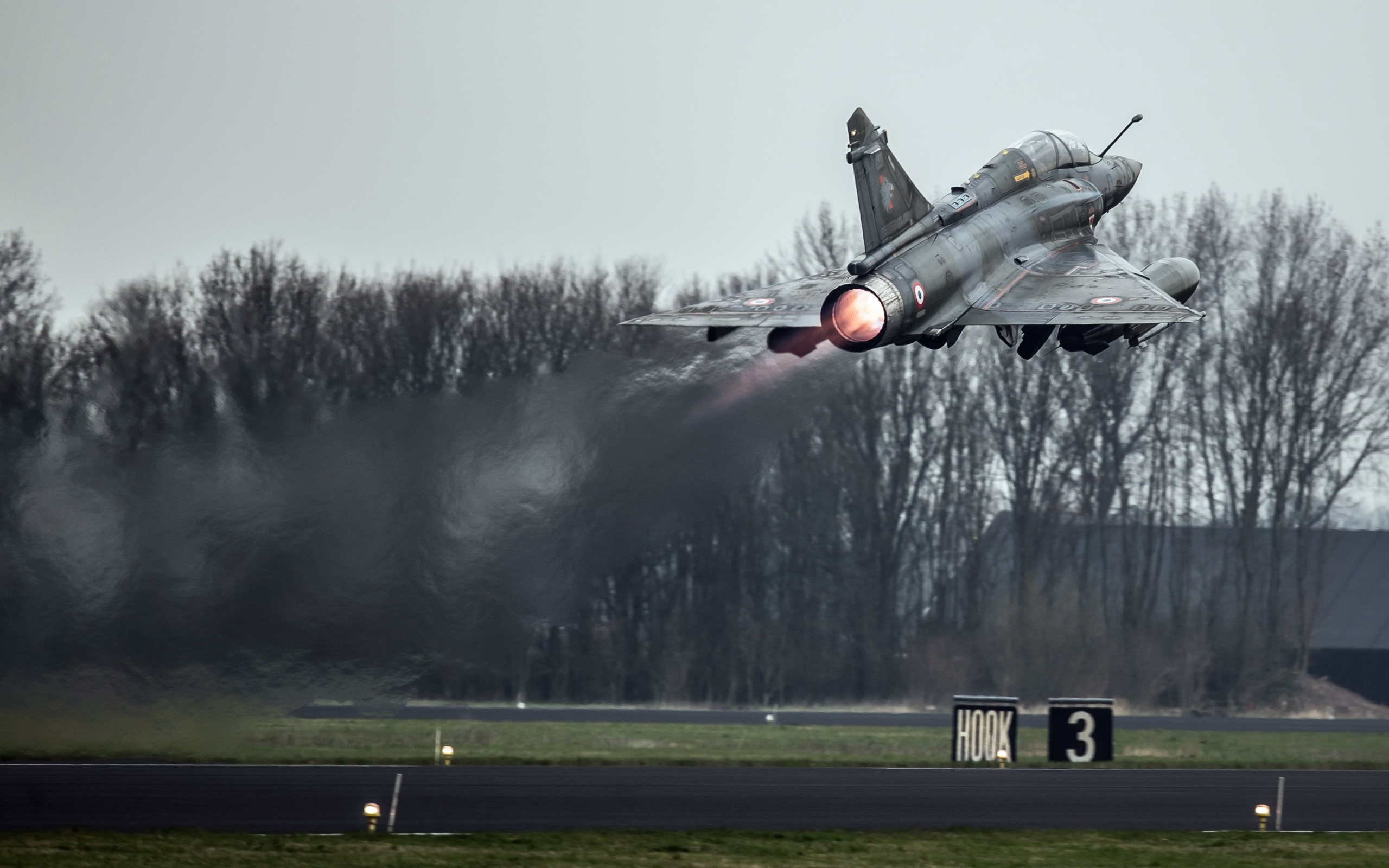 Description: A jet is flying low over a runway with trees in the background and smoke coming out of it's back end.