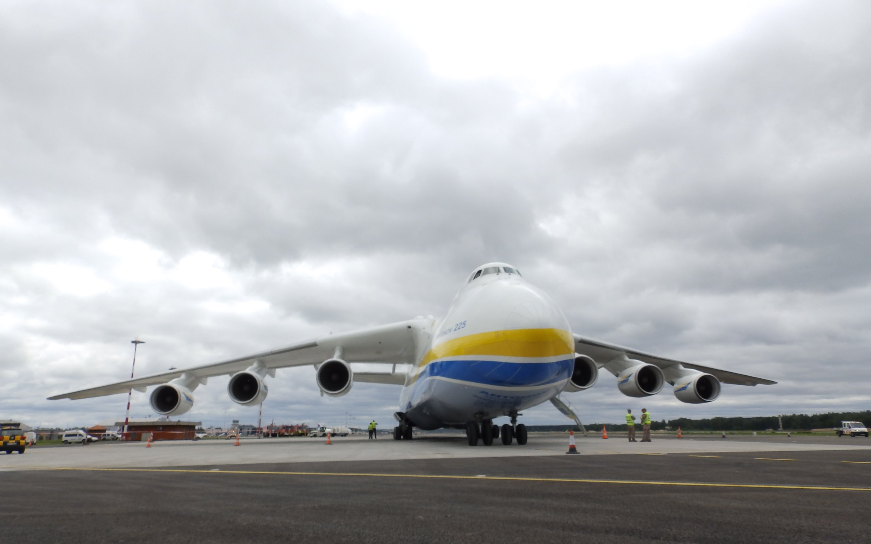 Description: A large jetliner sitting on top of an airport tarmac under a cloudy sky with a yellow and blue stripe.