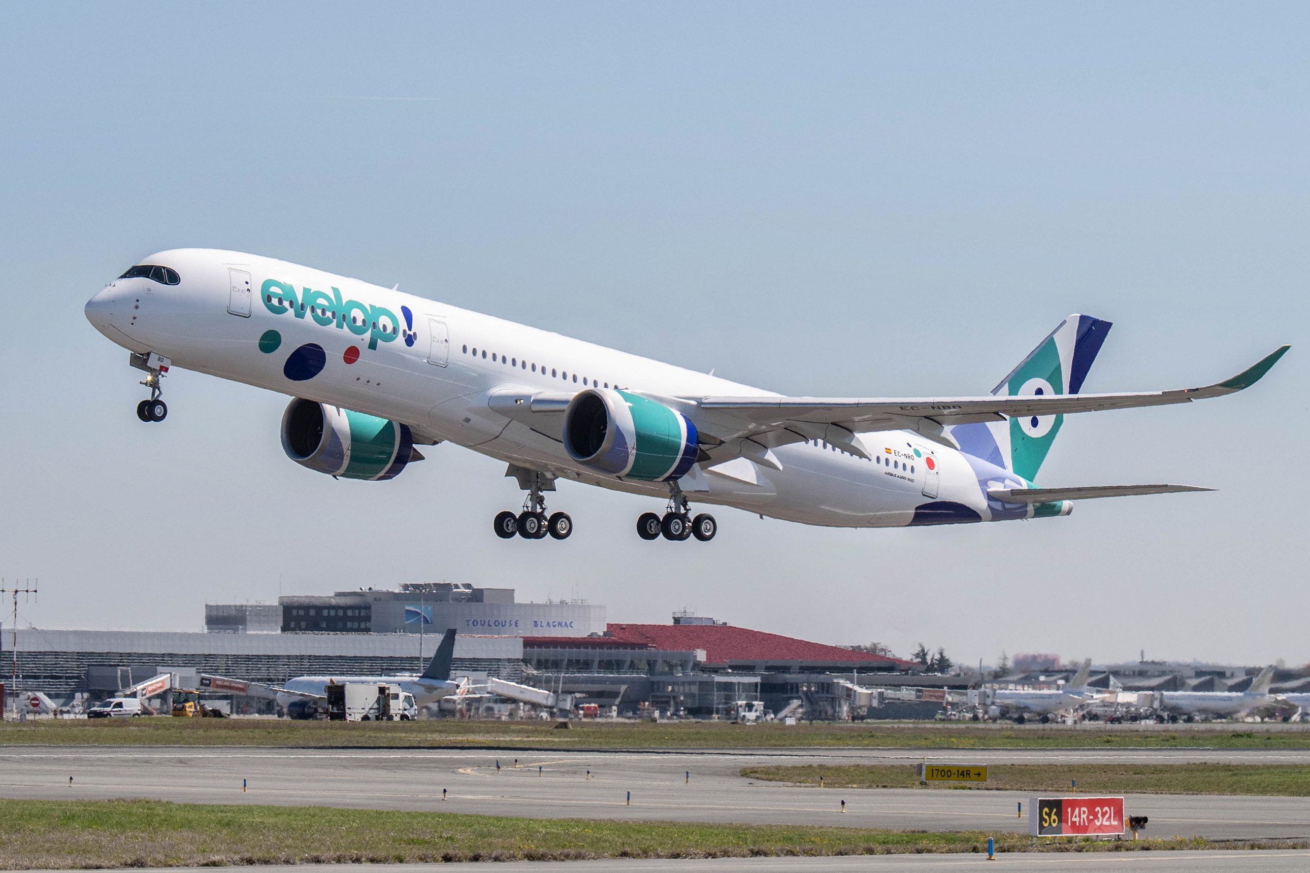 Description: A large jetliner flying through a blue sky over a runway with buildings in the background and a sky line.