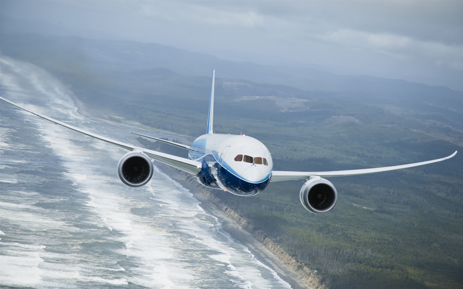Description: A large jetliner flying over a lush green hillside next to the ocean on a cloudy day with a sky background.